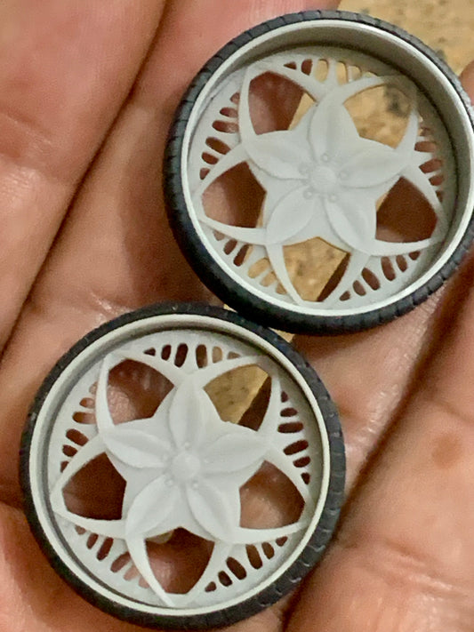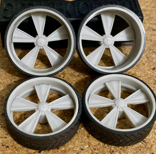 A collection of 1/25 scale 5-lug rims.