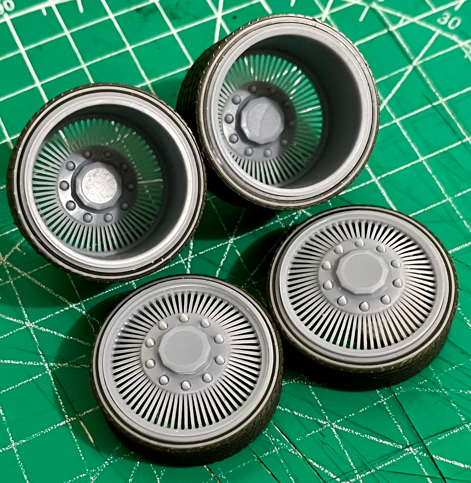 - 3D printed resin wheels & tires for a 1/25 scale.