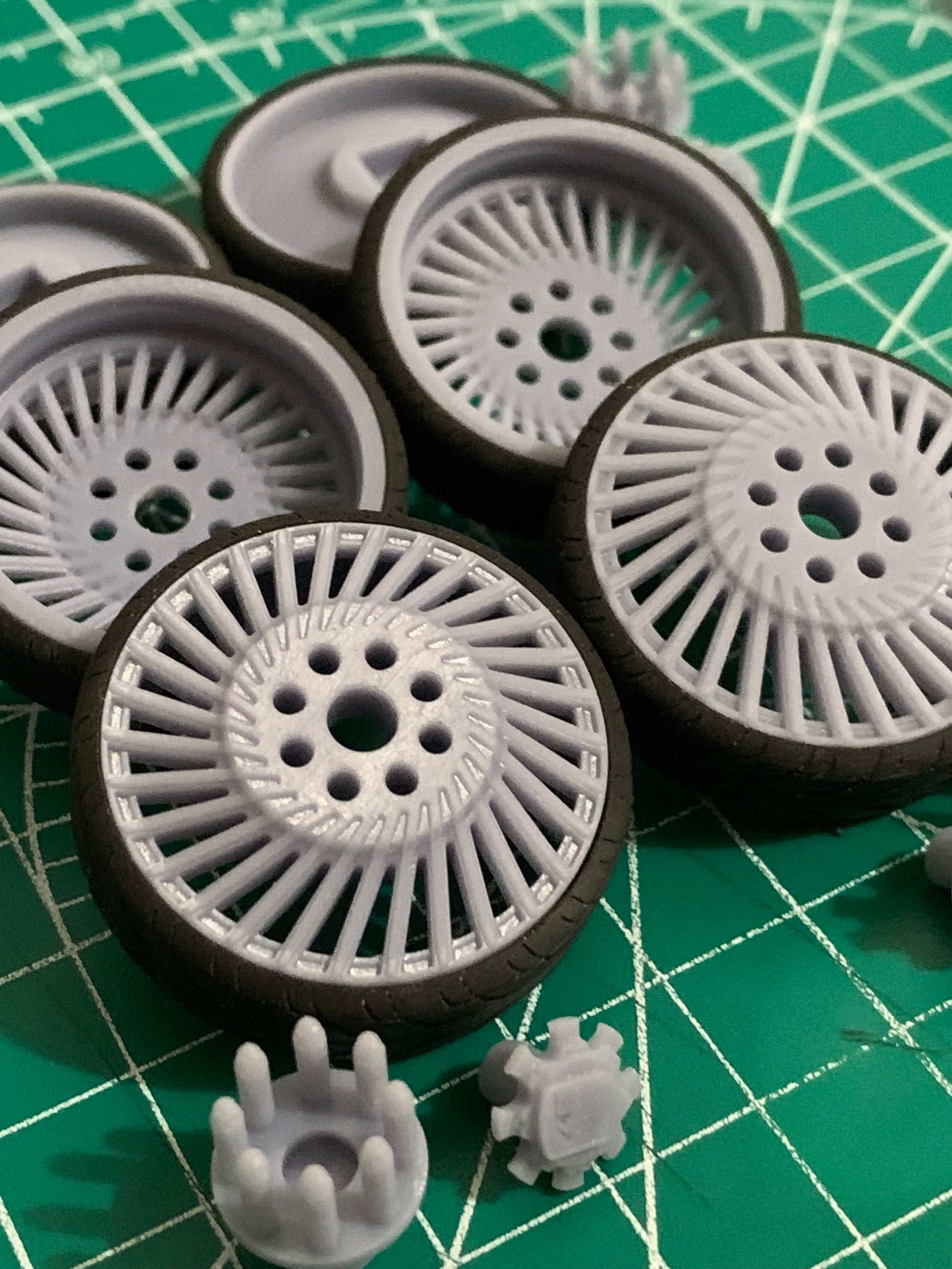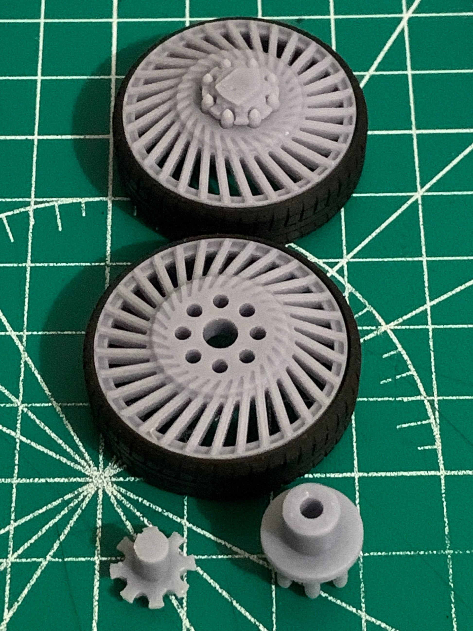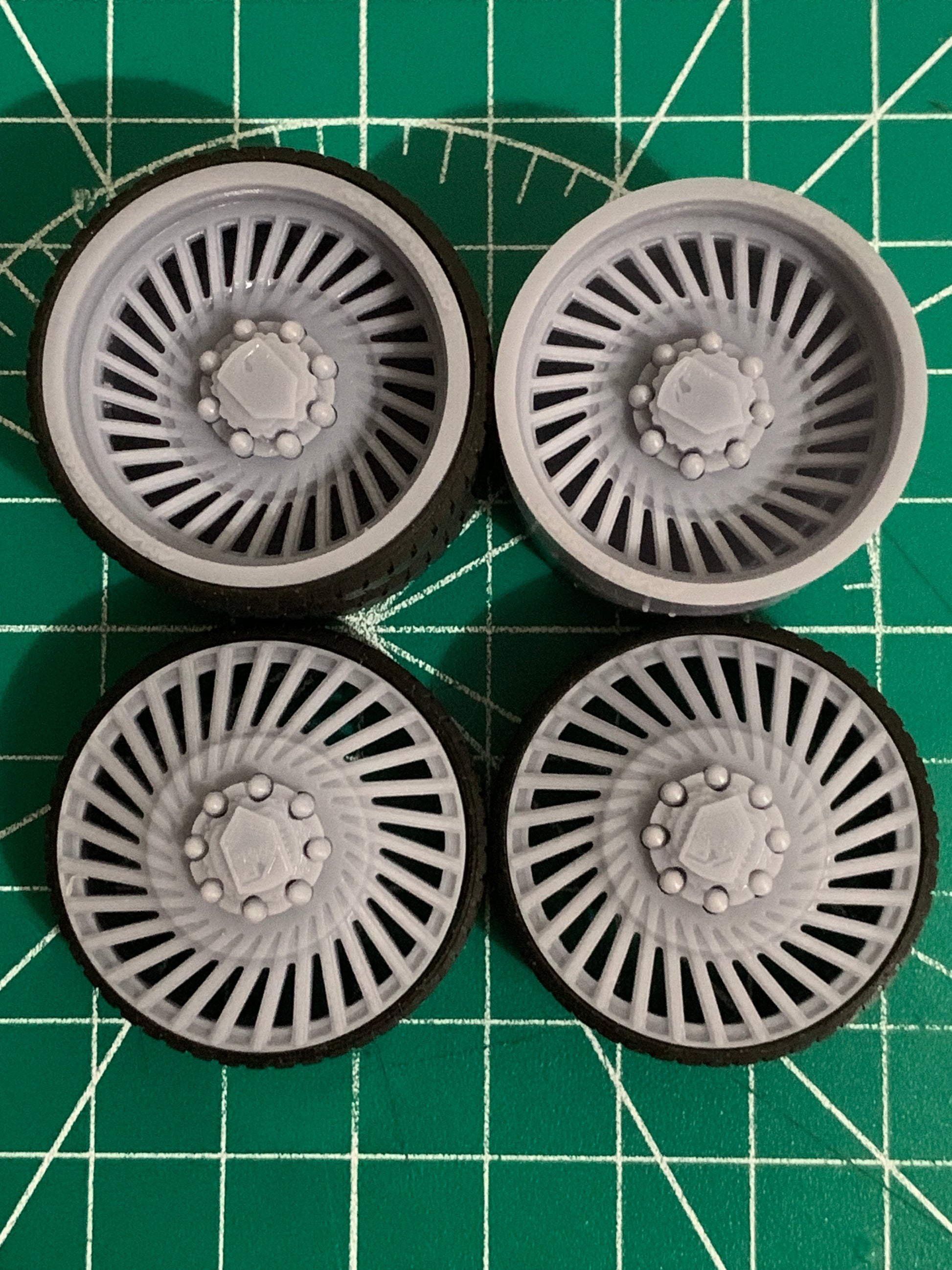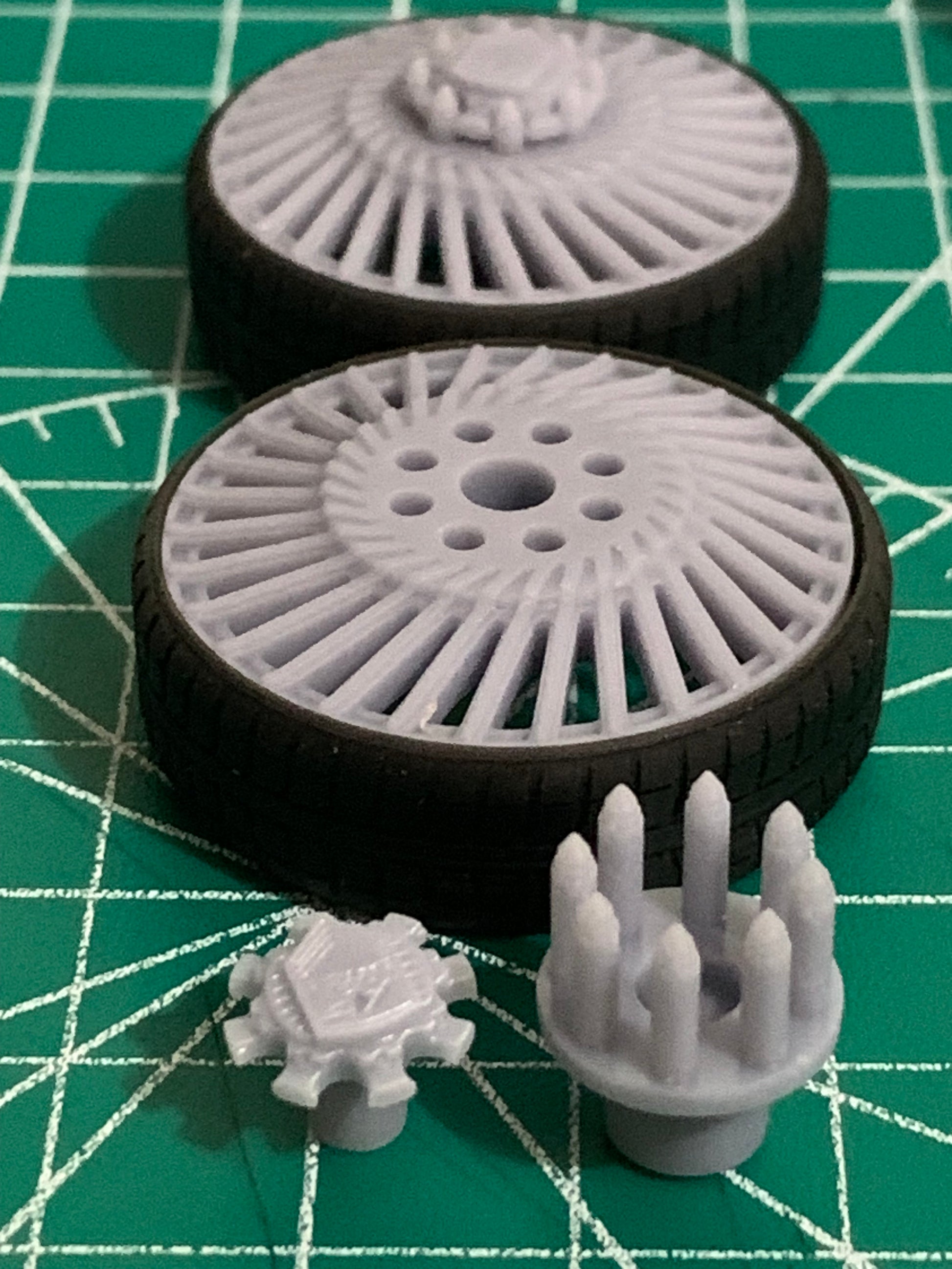 - 3D printed resin wheels & tires for a 1/25 scale model.