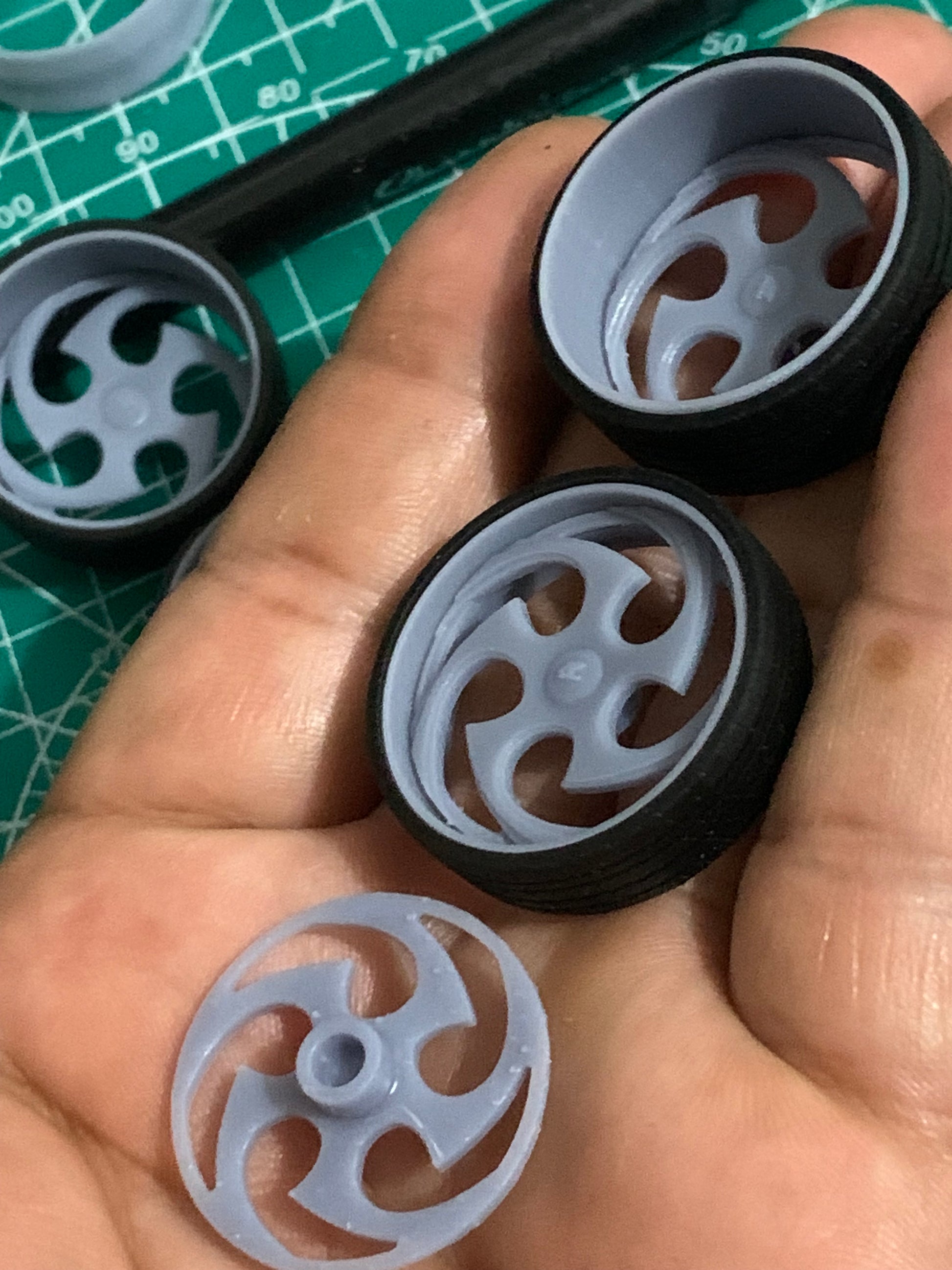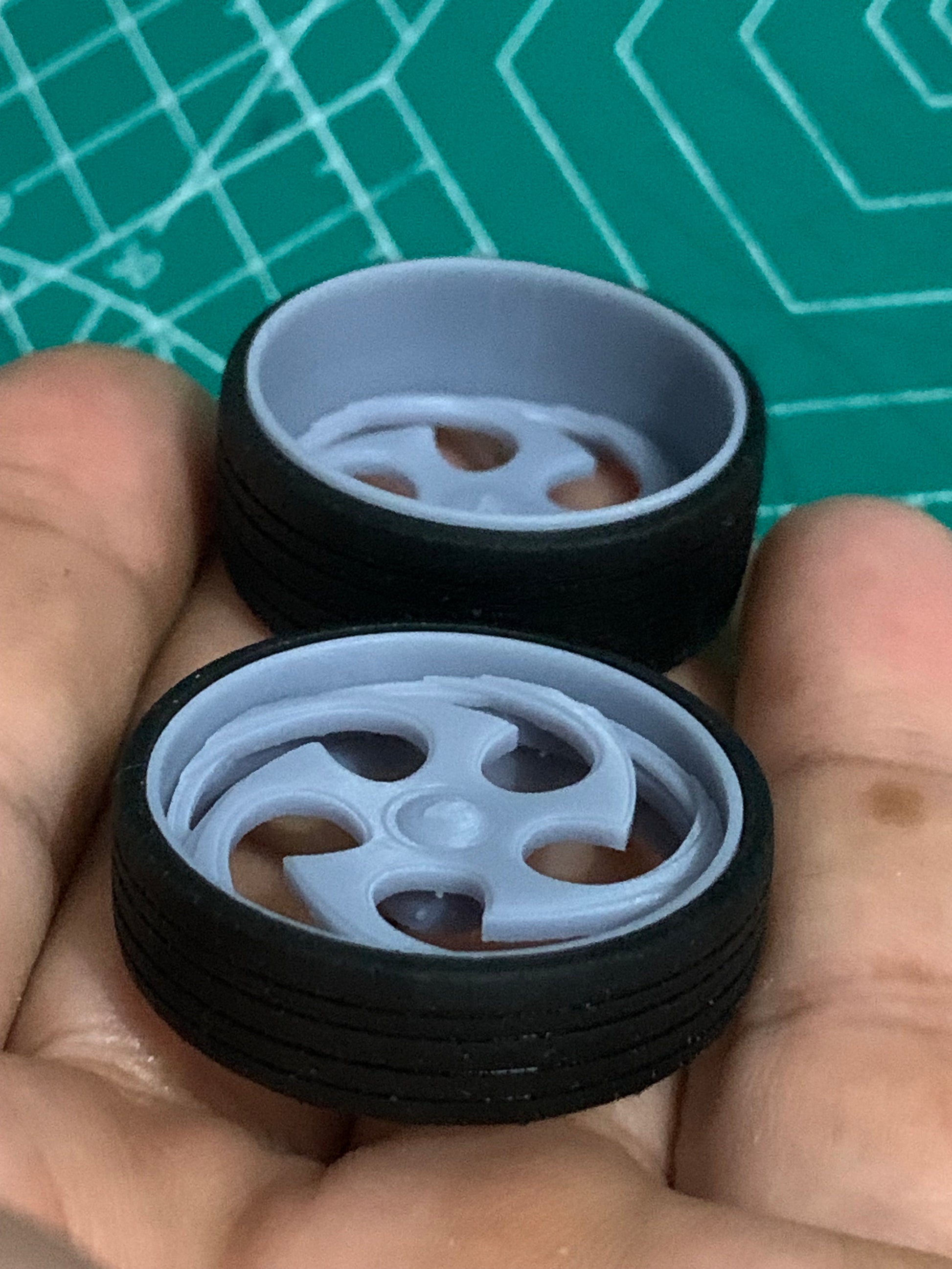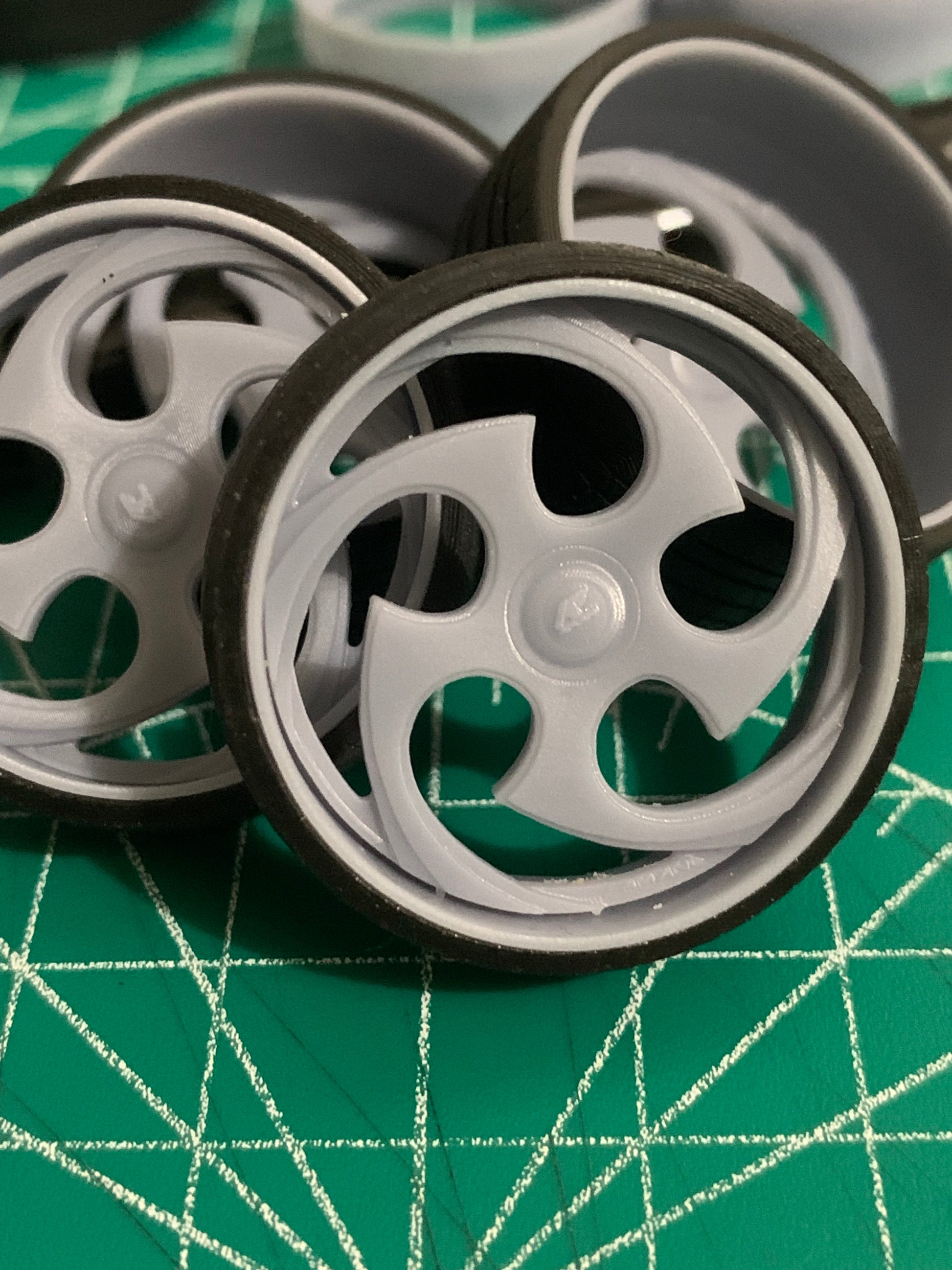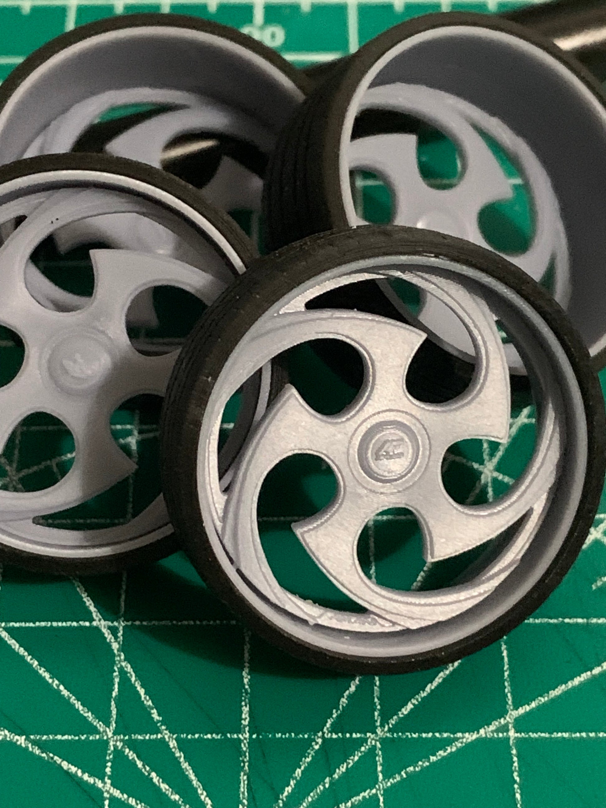 - 3D printed resin wheels & tires for a 1/25 scale.