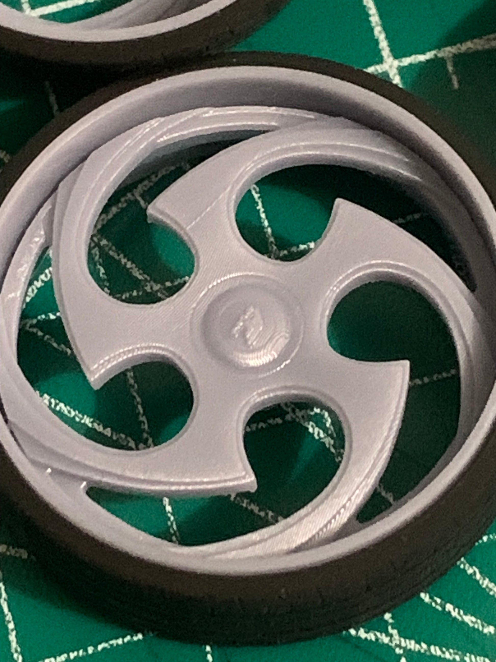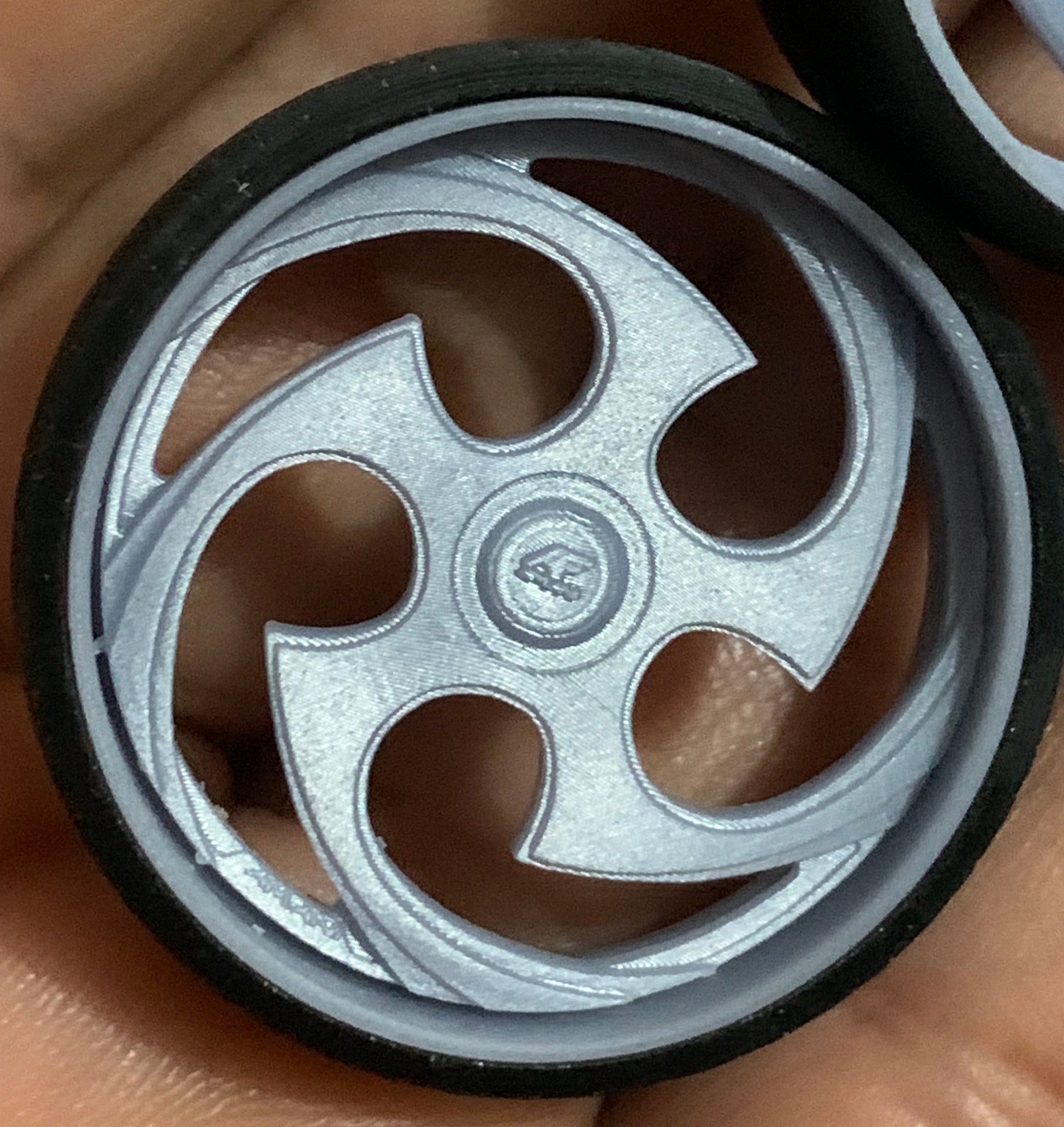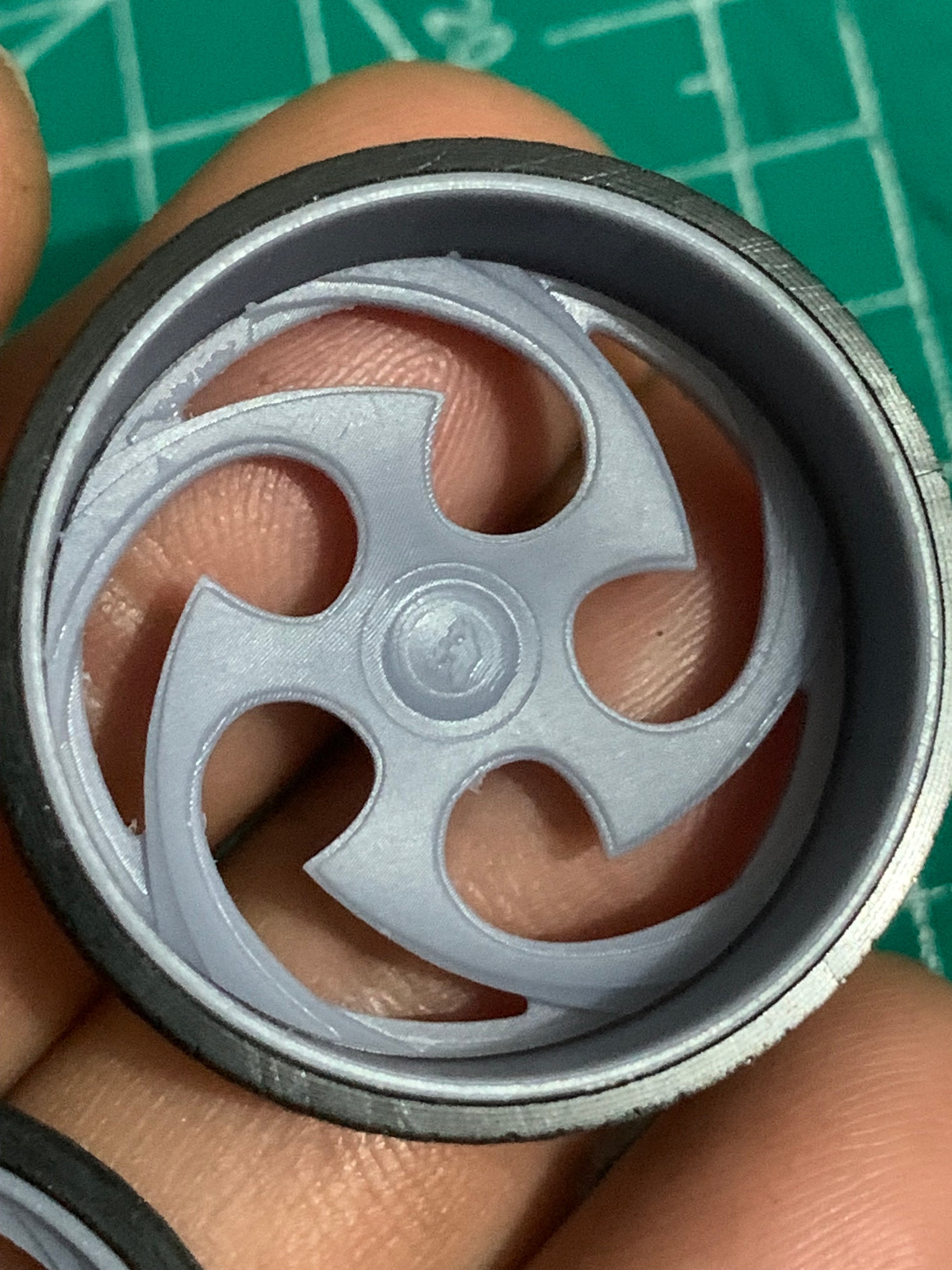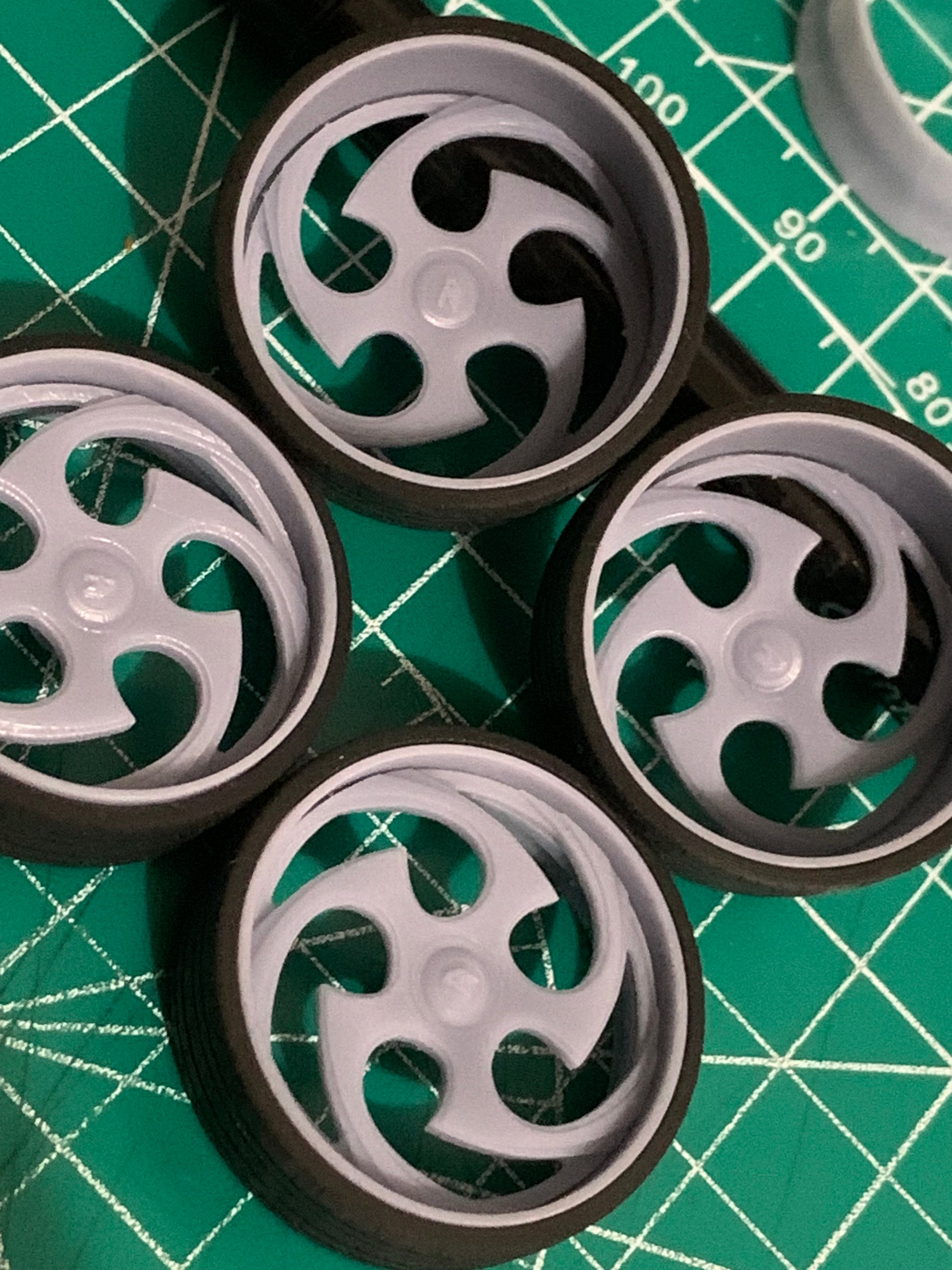 - 3D printed resin wheels & tires for a 1/25 scale.