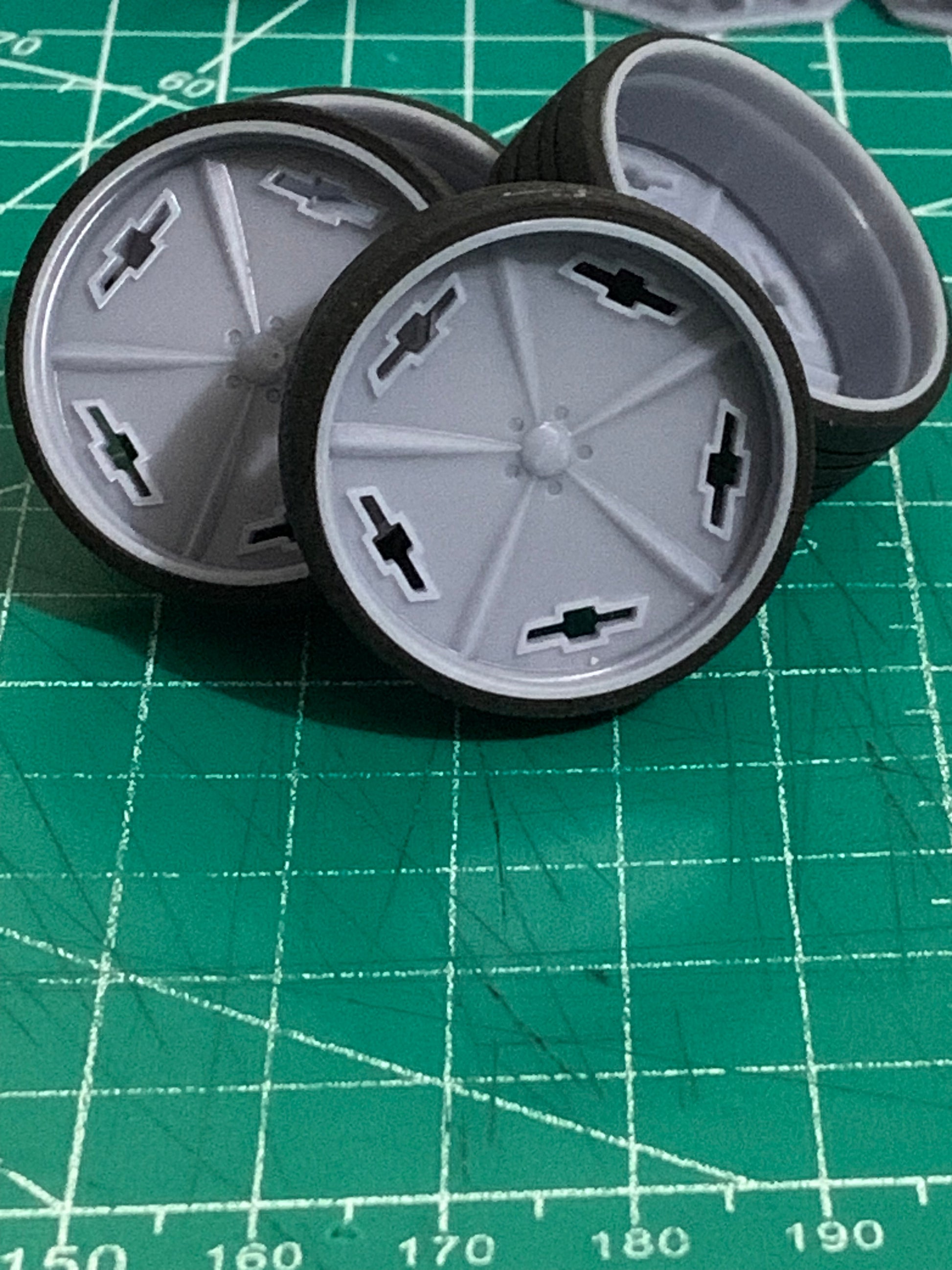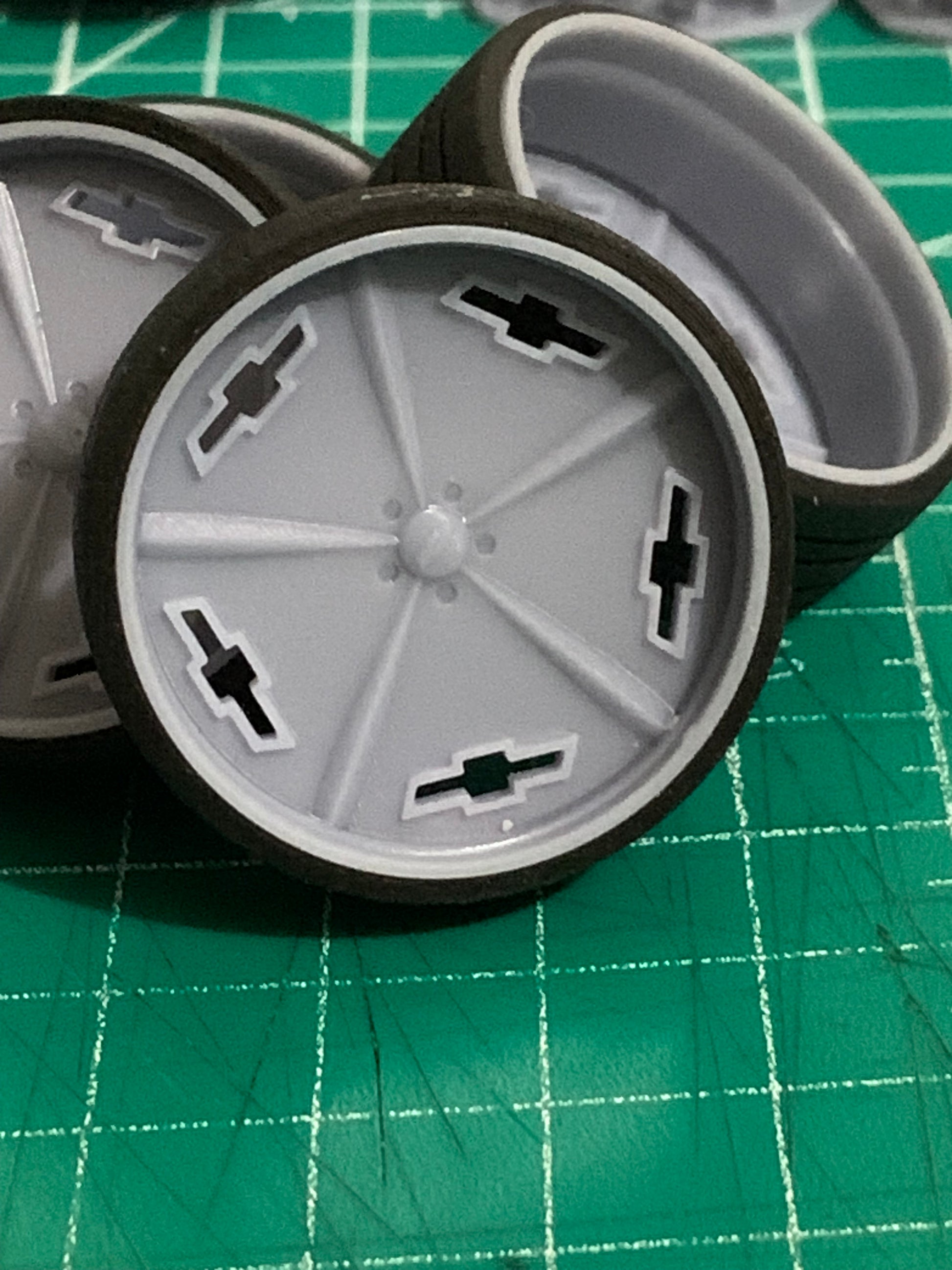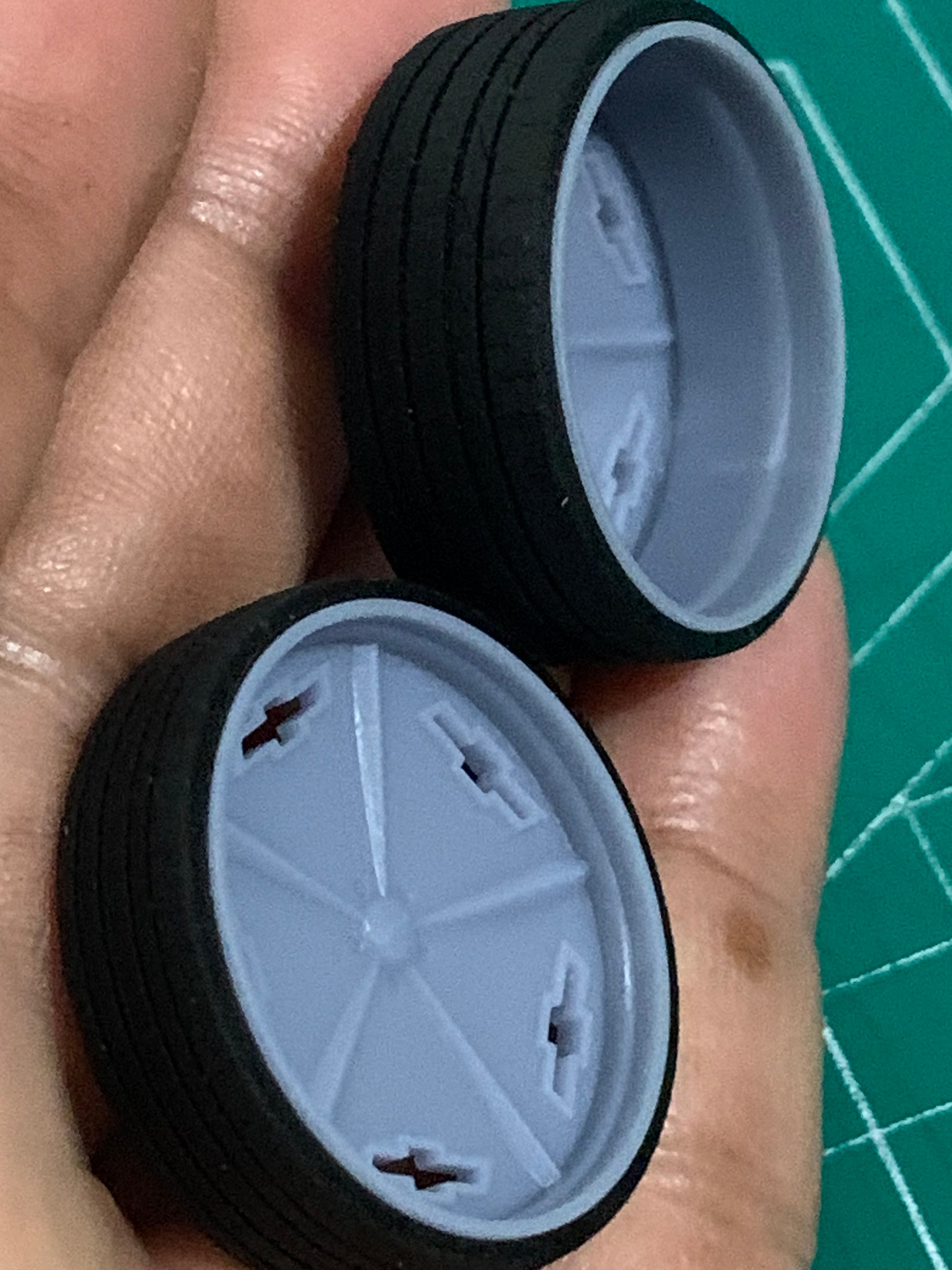 - 3D printed resin wheels & tires for a 1/25 scale.