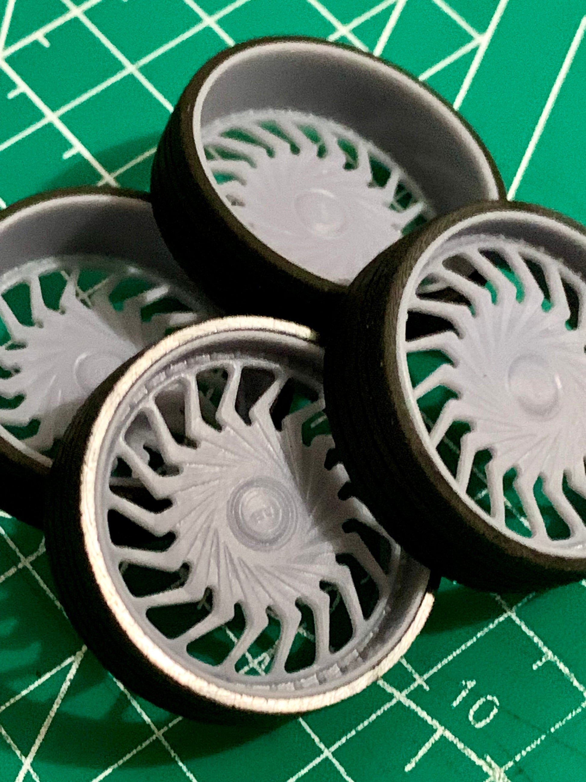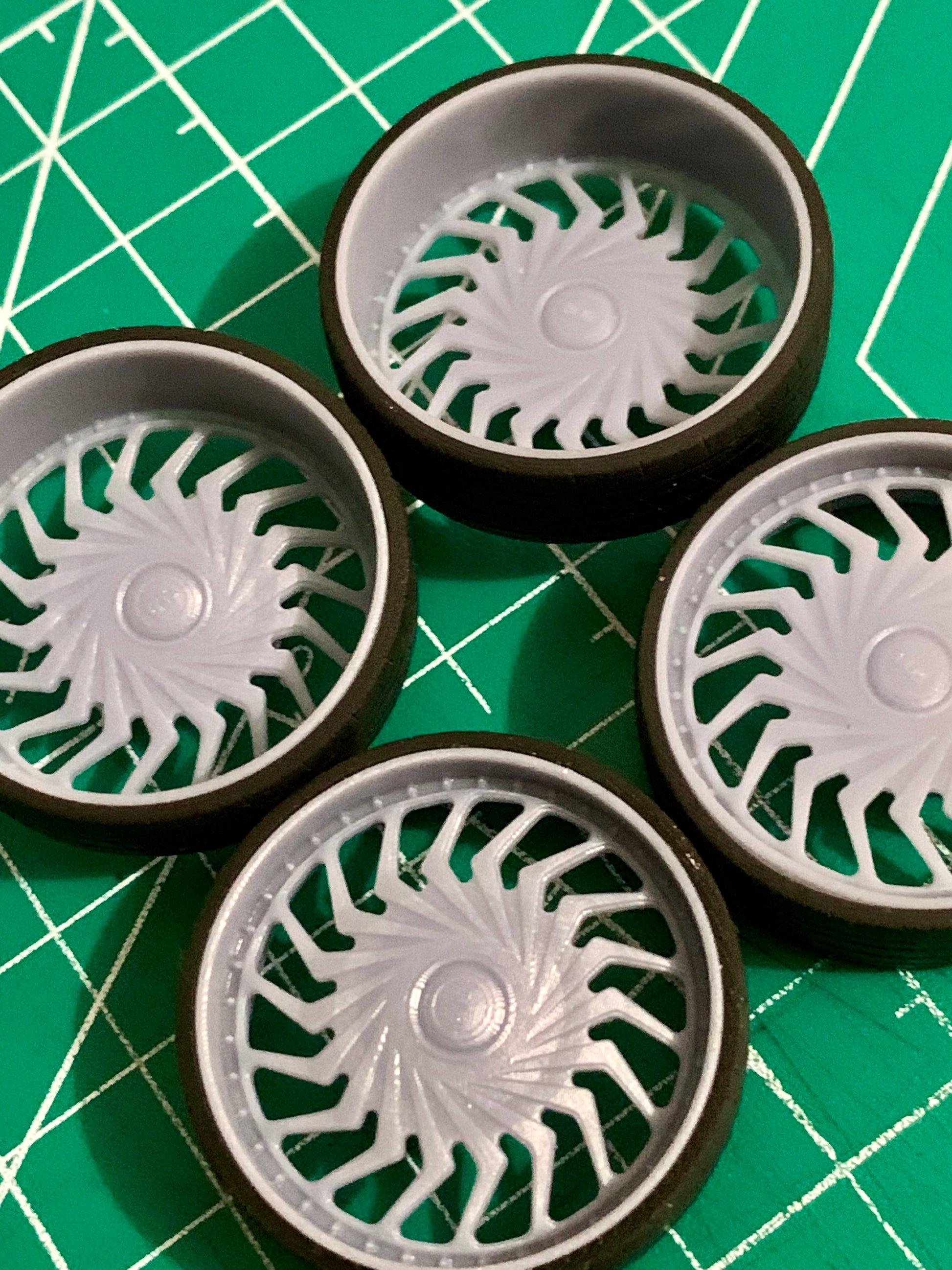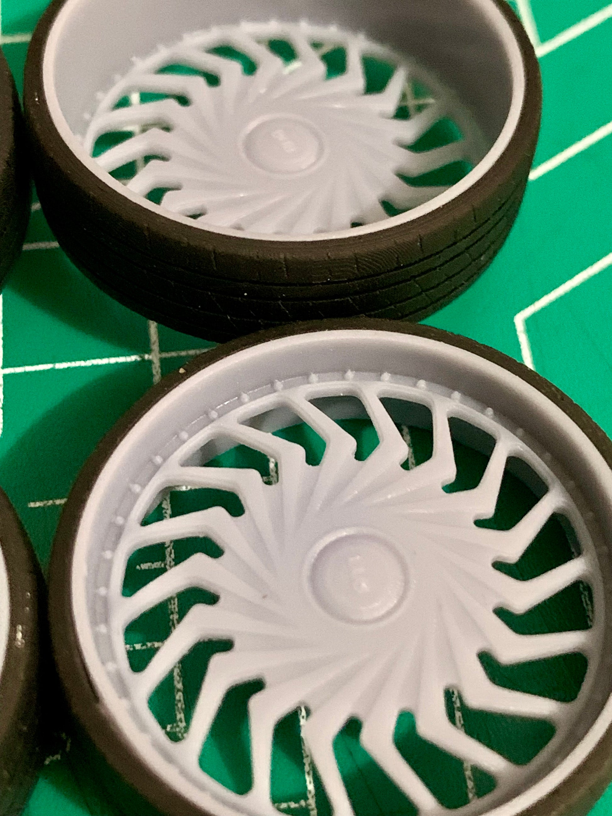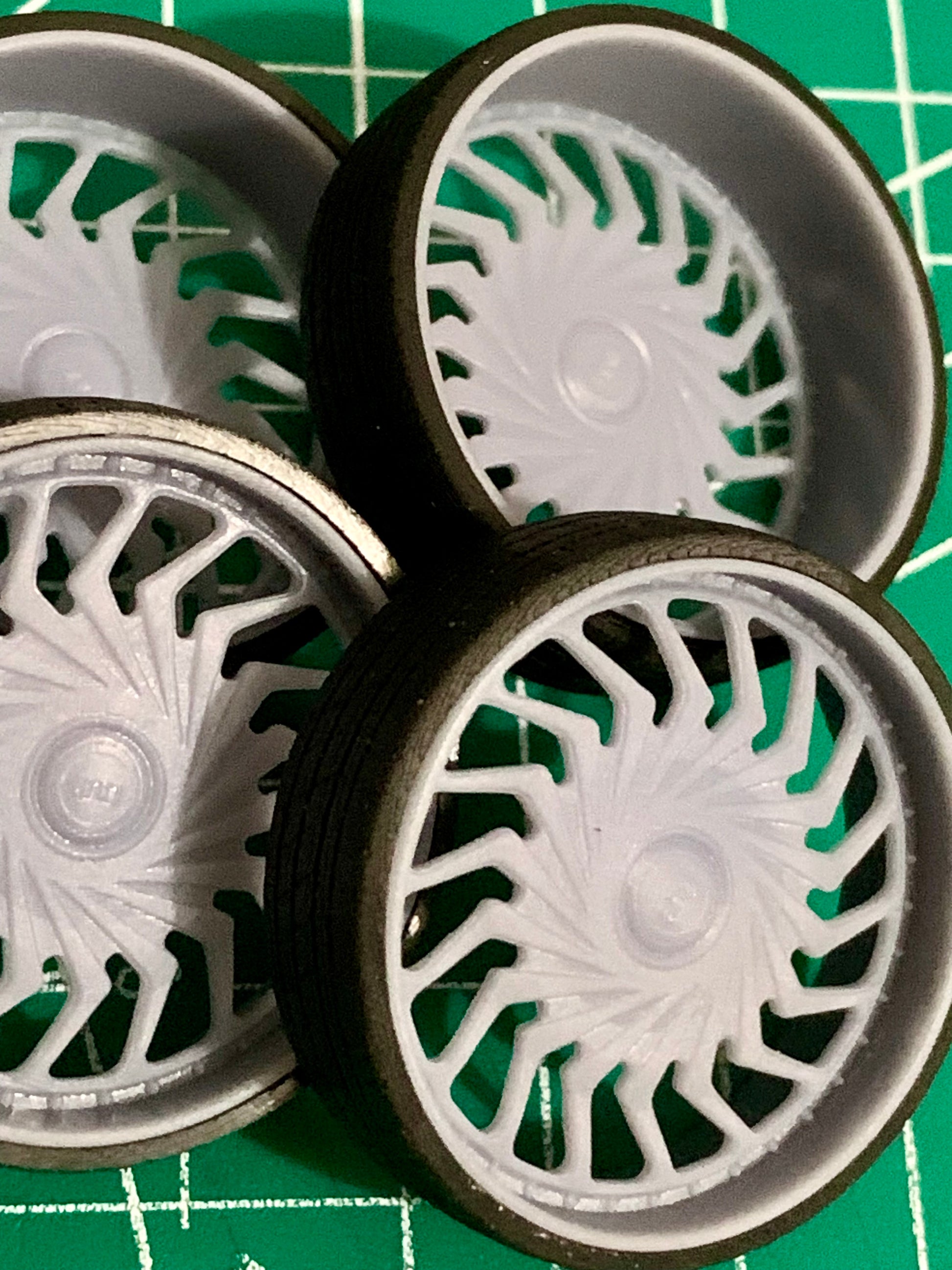 - 3D printed resin wheels & tires for a 1/25 scale.