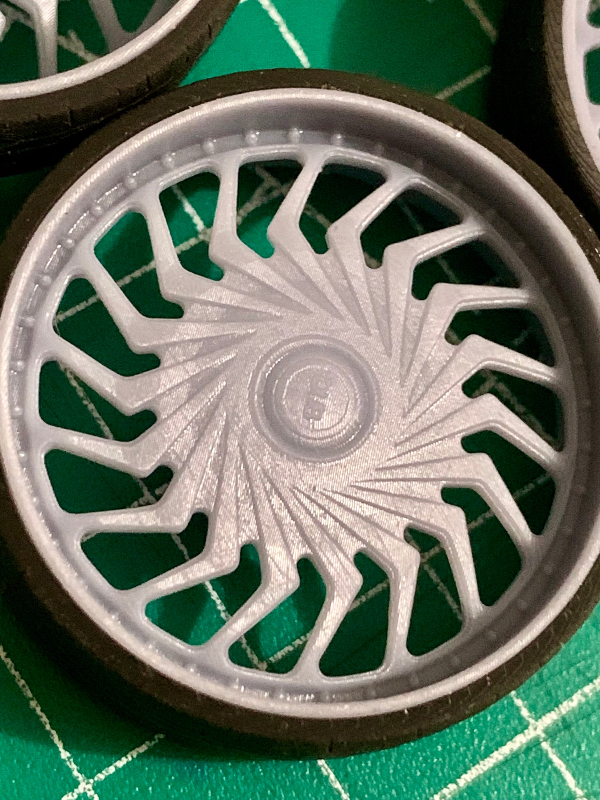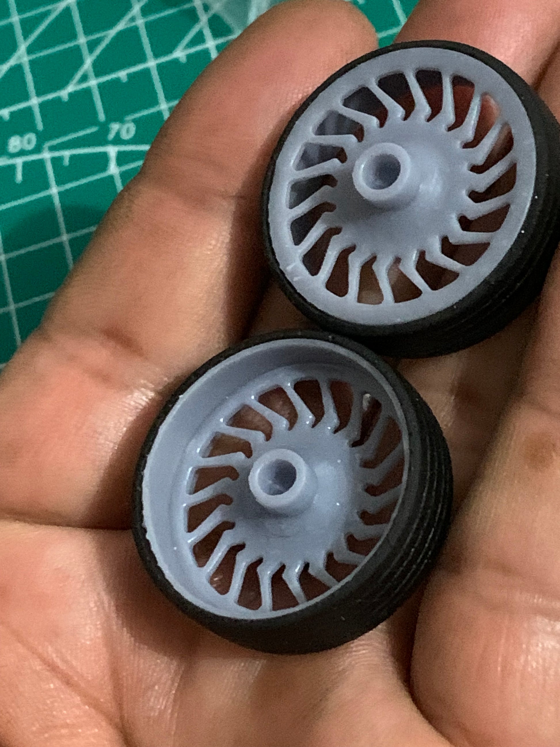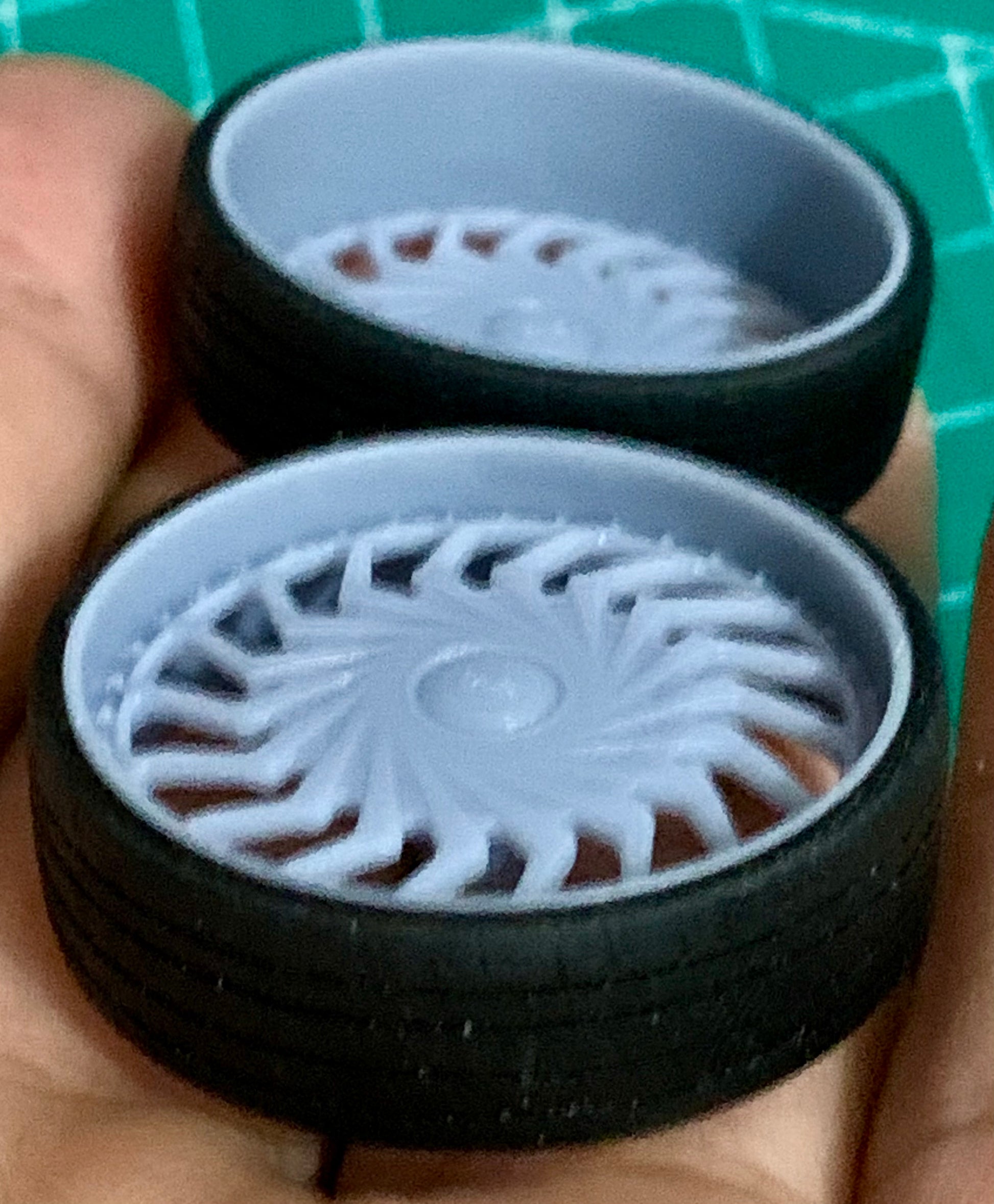 - 3D printed resin wheels & tires for a 1/25 scale.