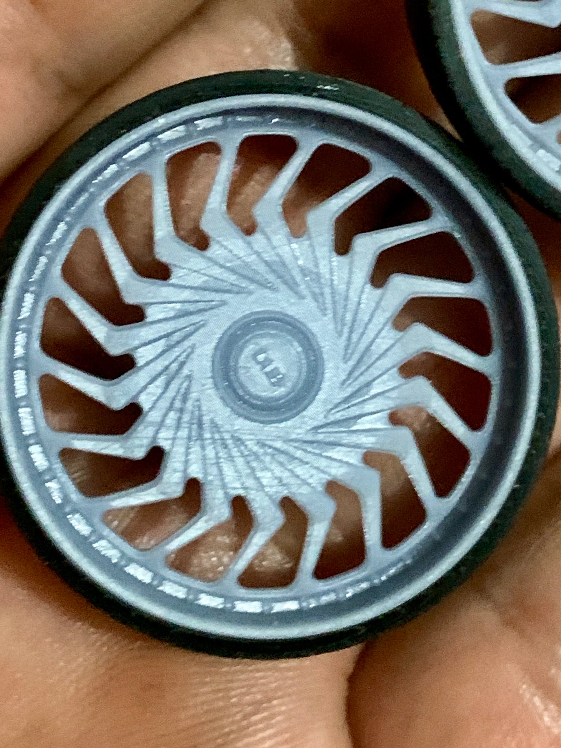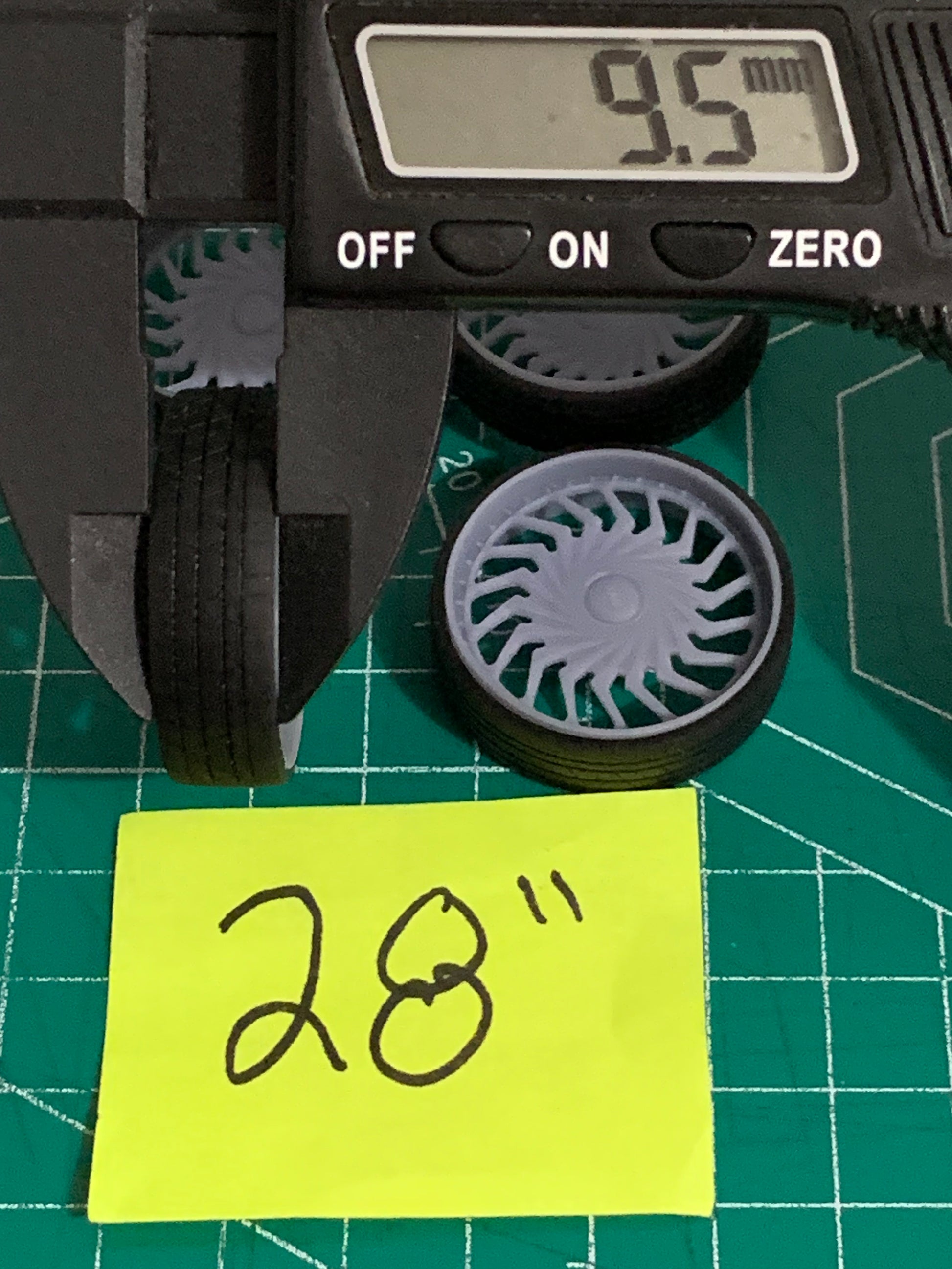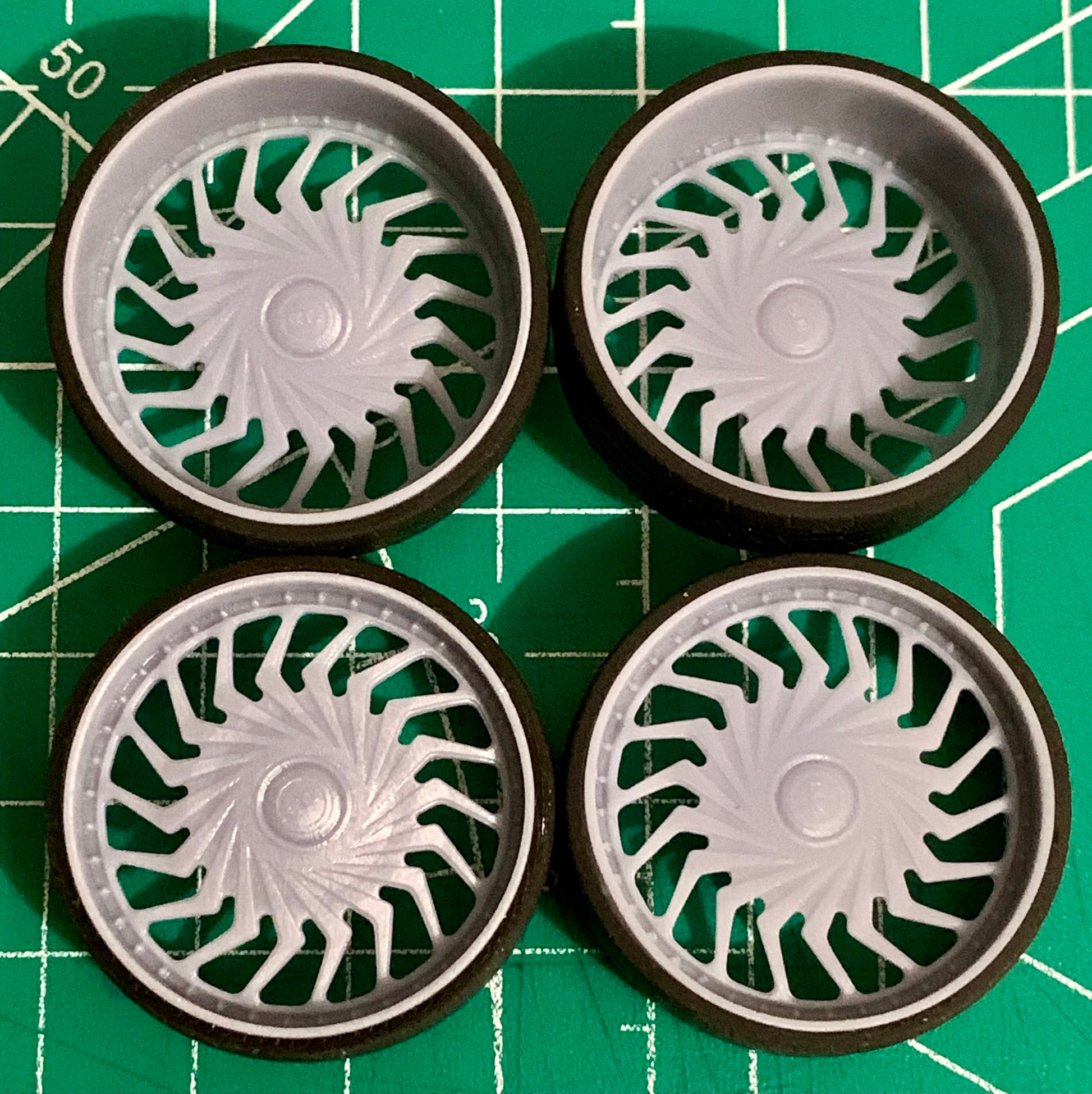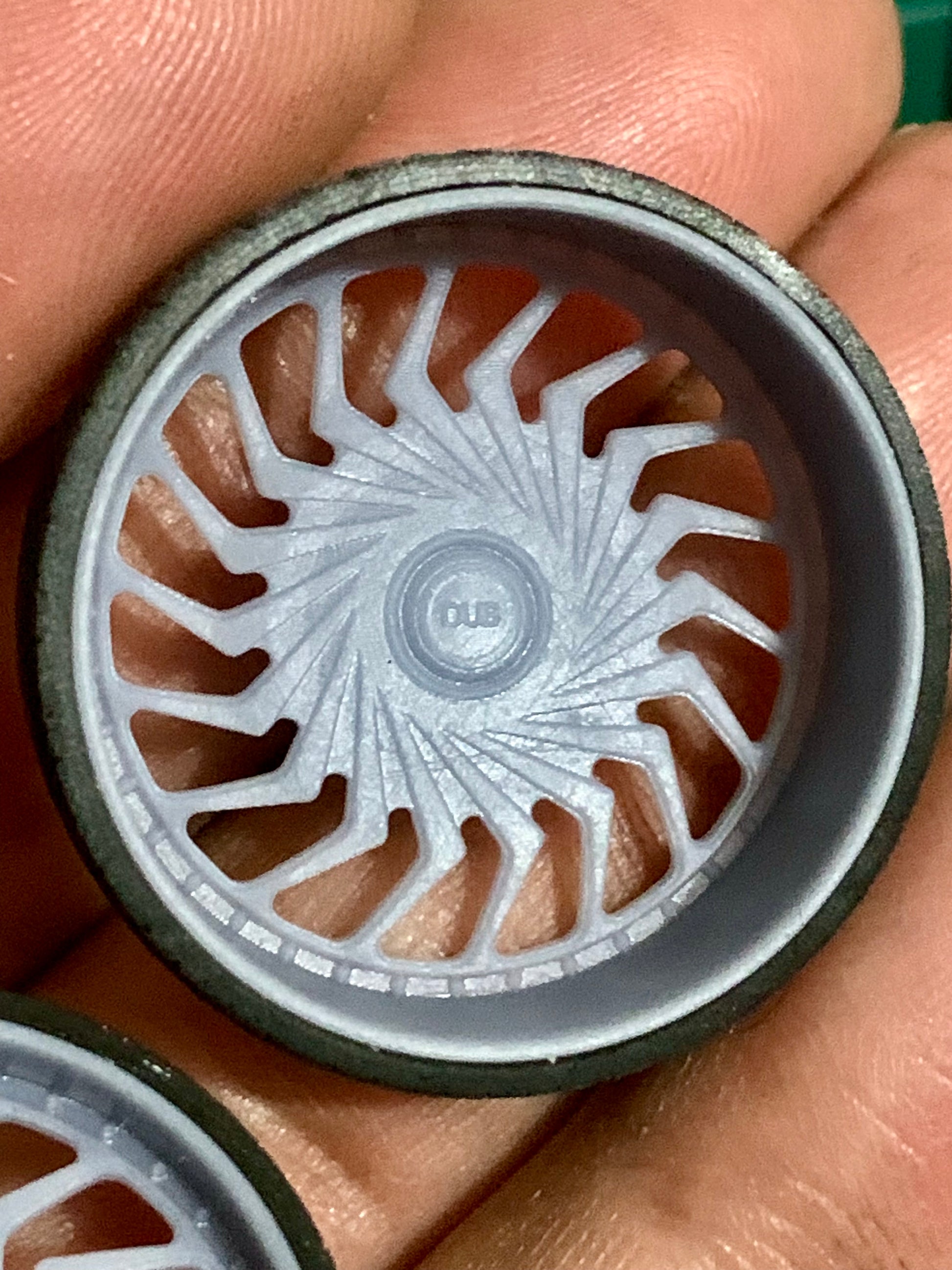 - 3D printed resin wheels & tires for a 1/25 scale.