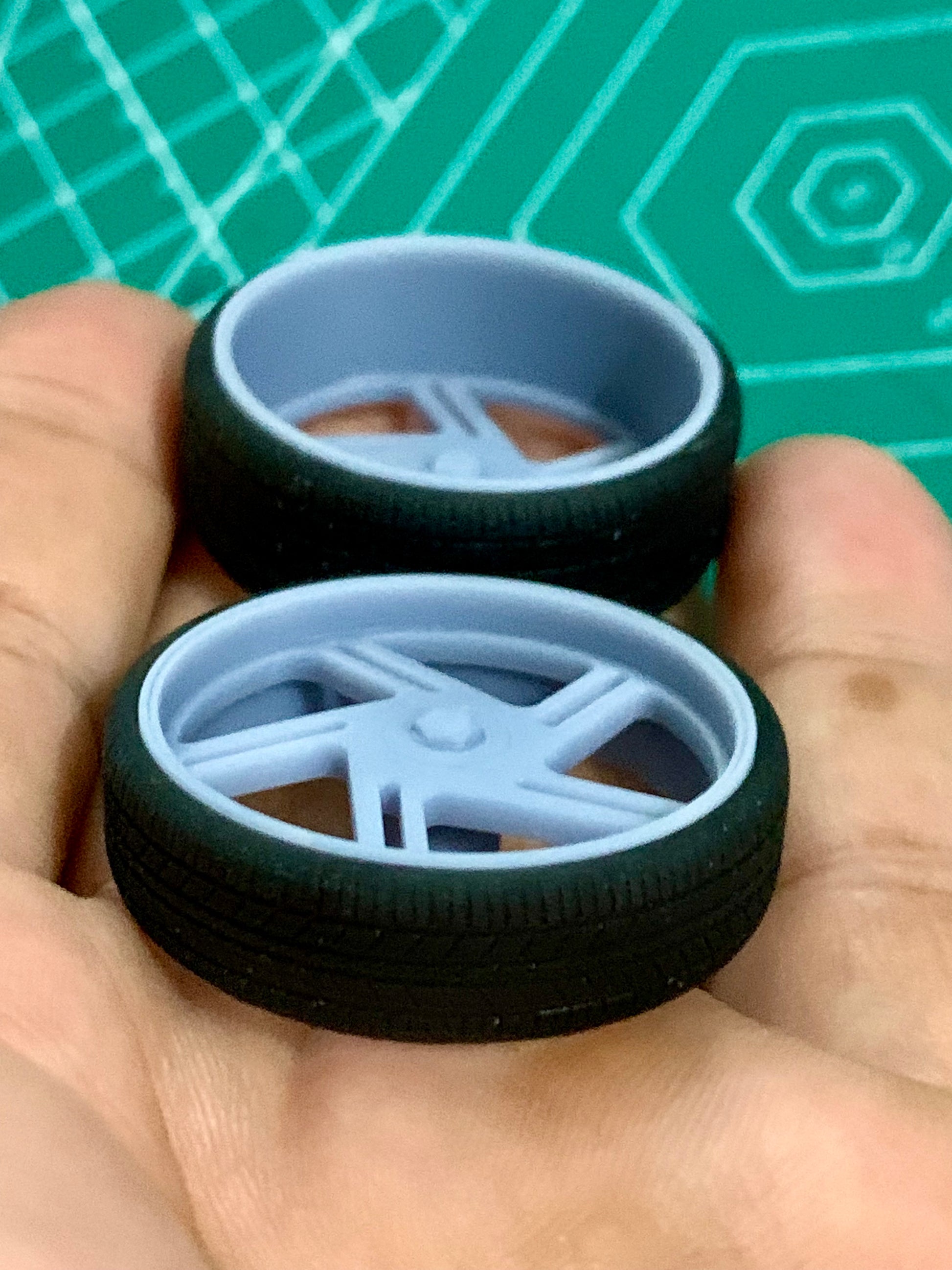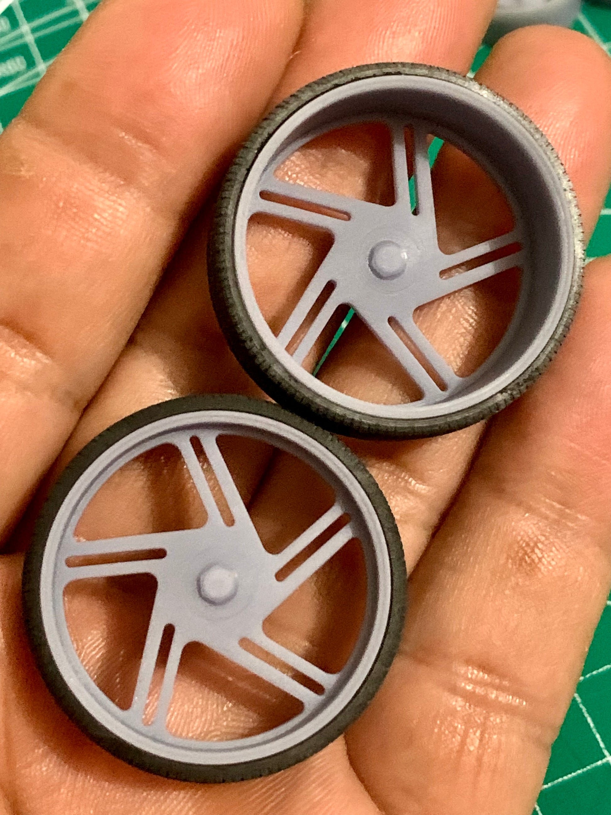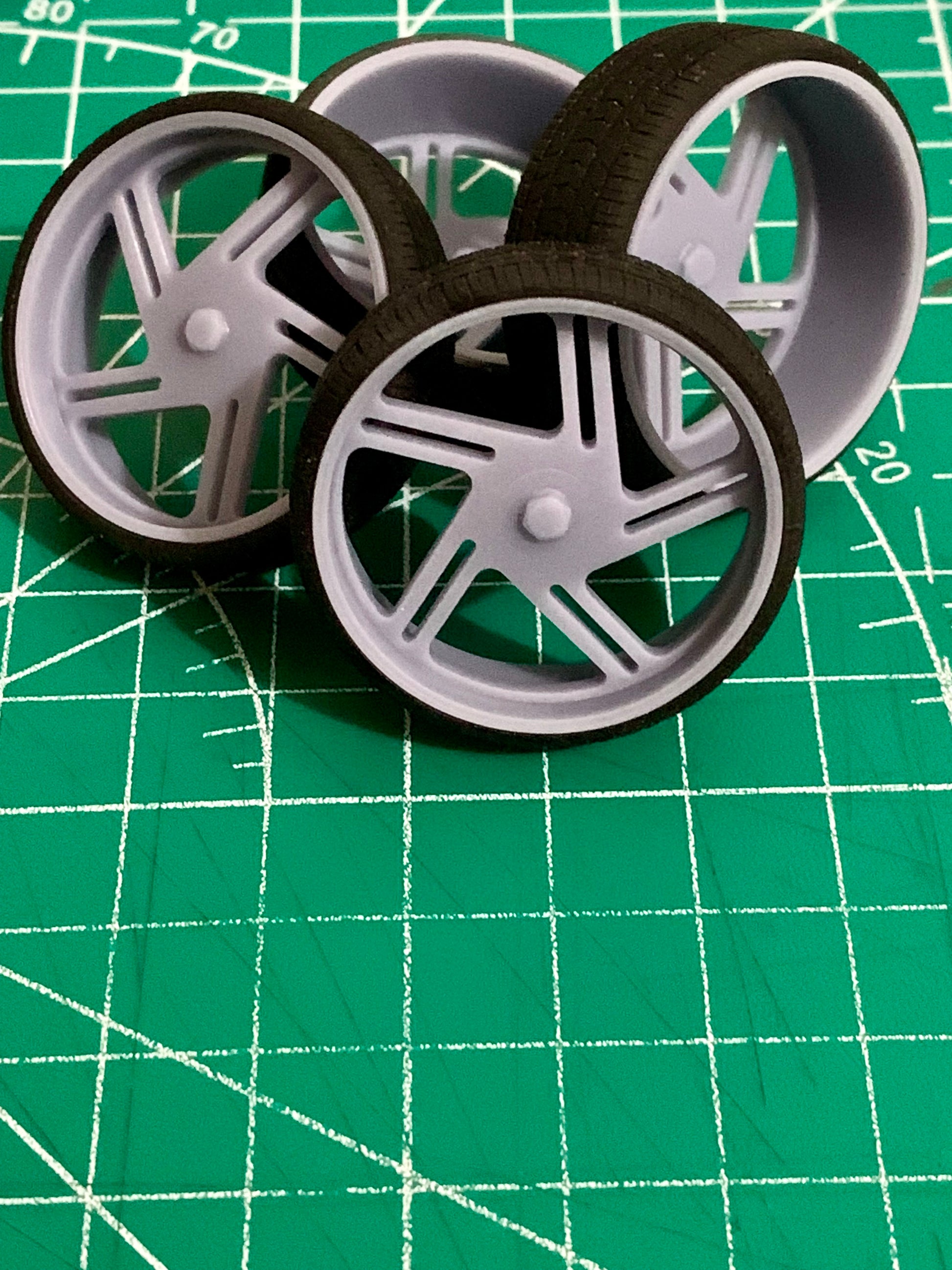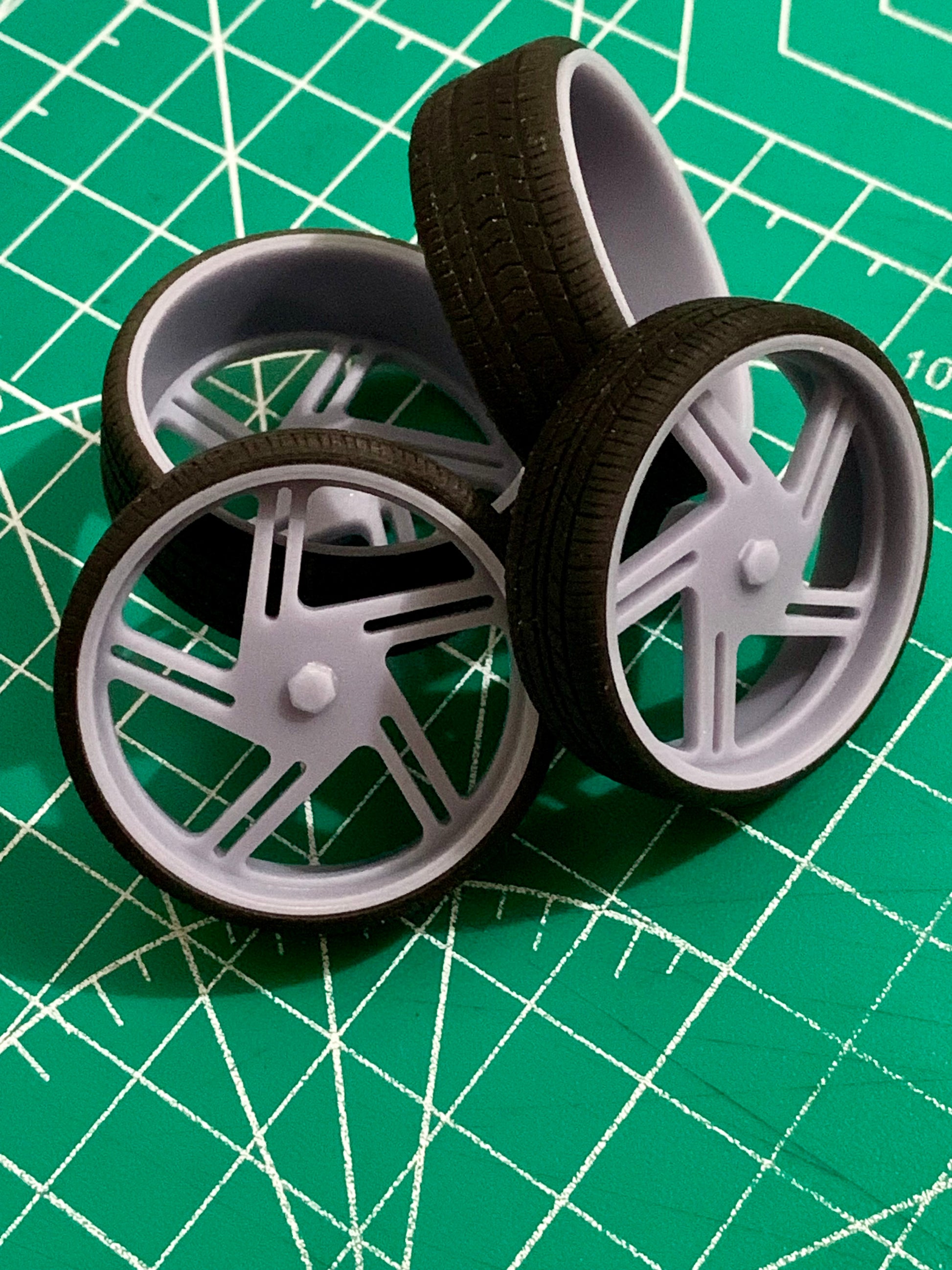 - 3D printed resin wheels & tires for a 1/25 scale.