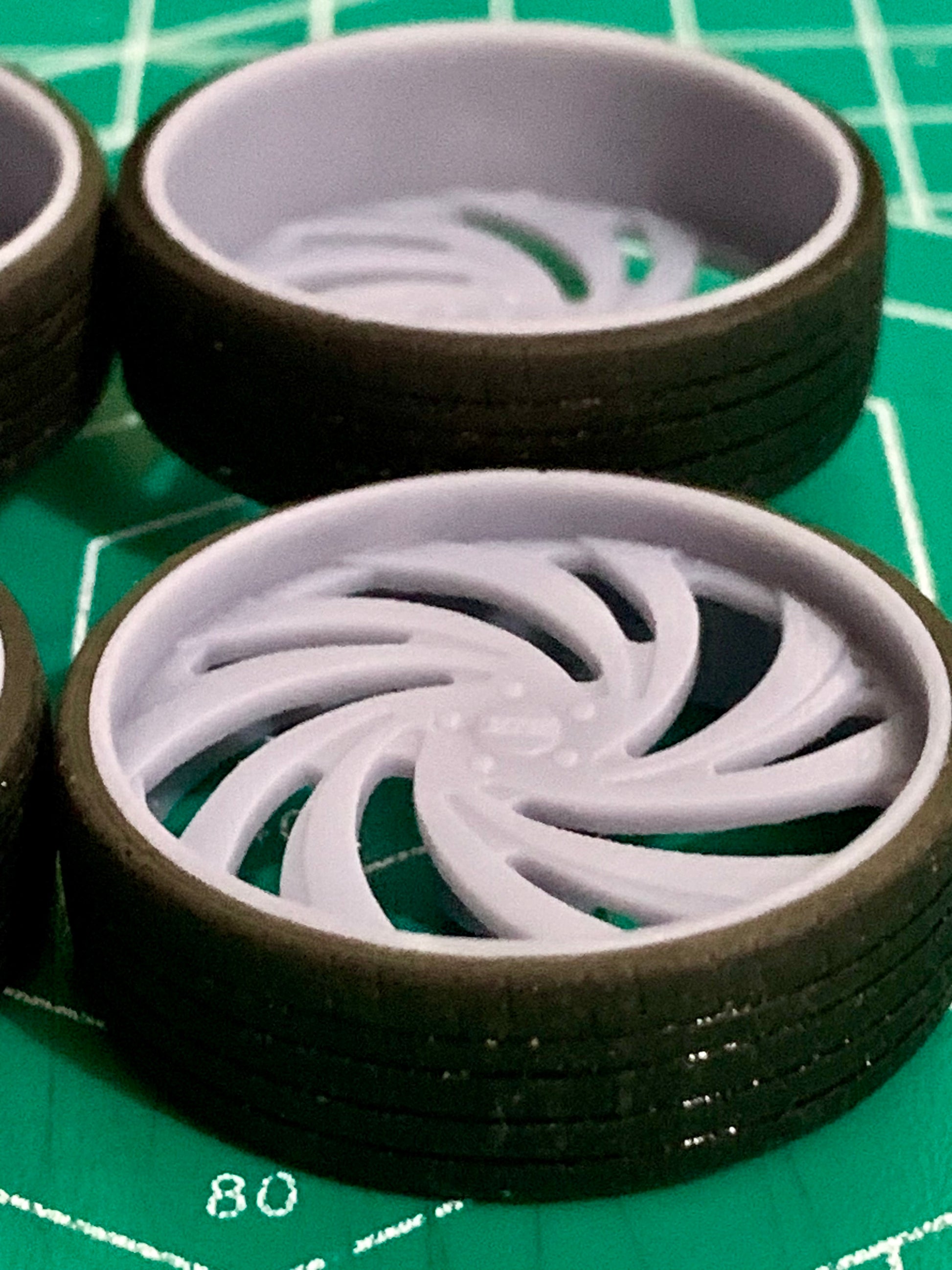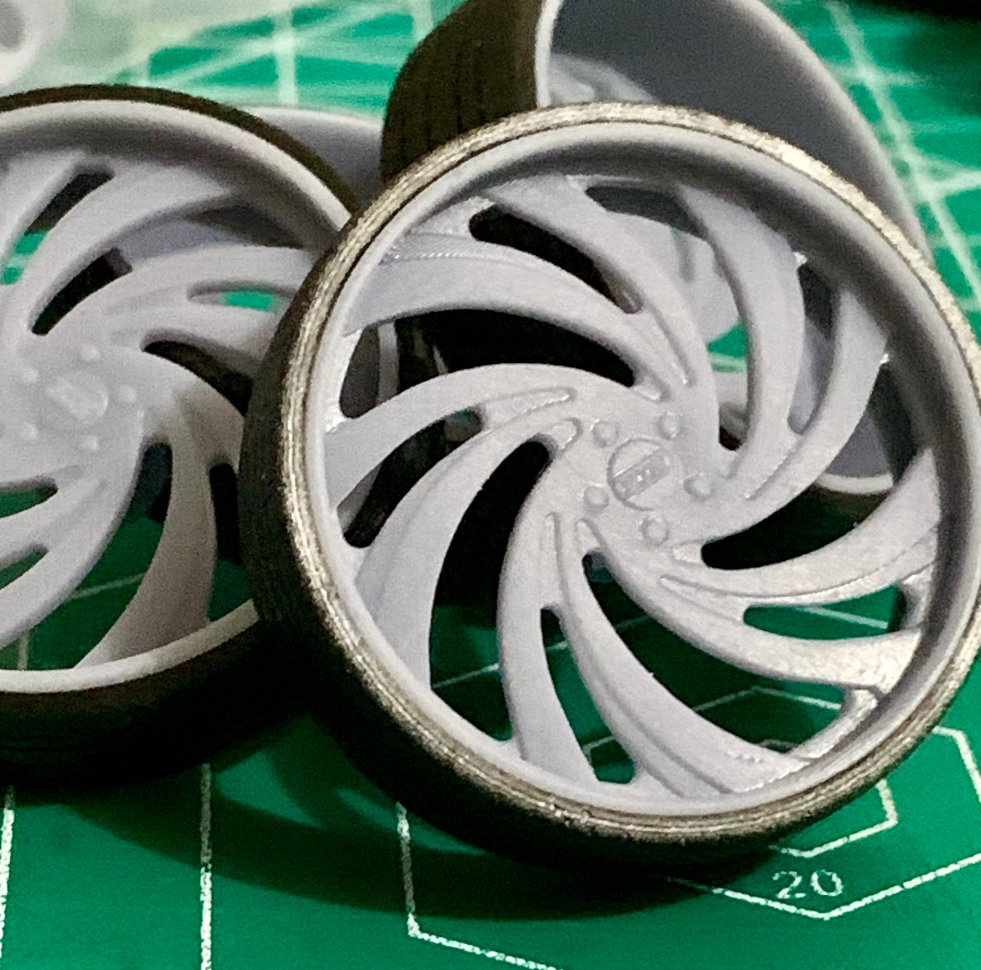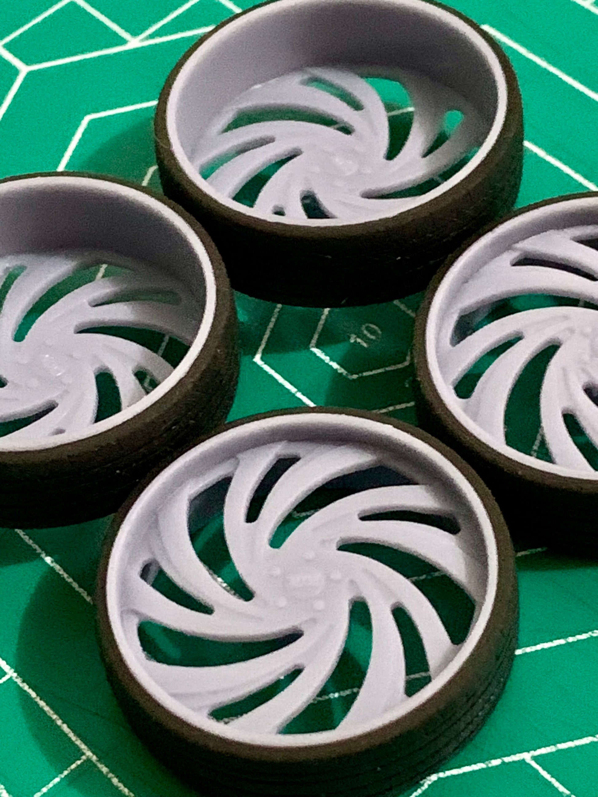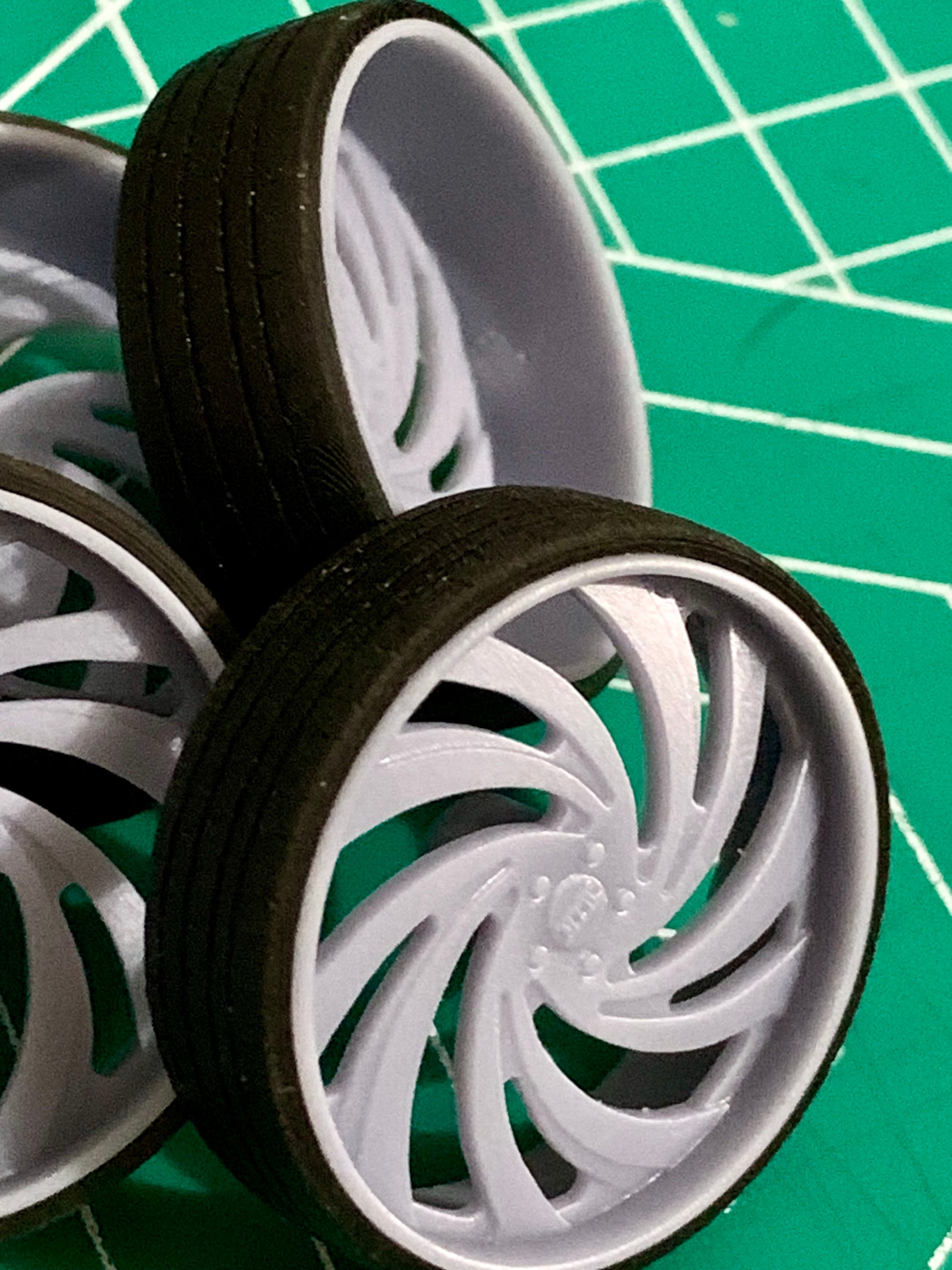 - 3D printed resin wheels & tires for a 1/25 scale.