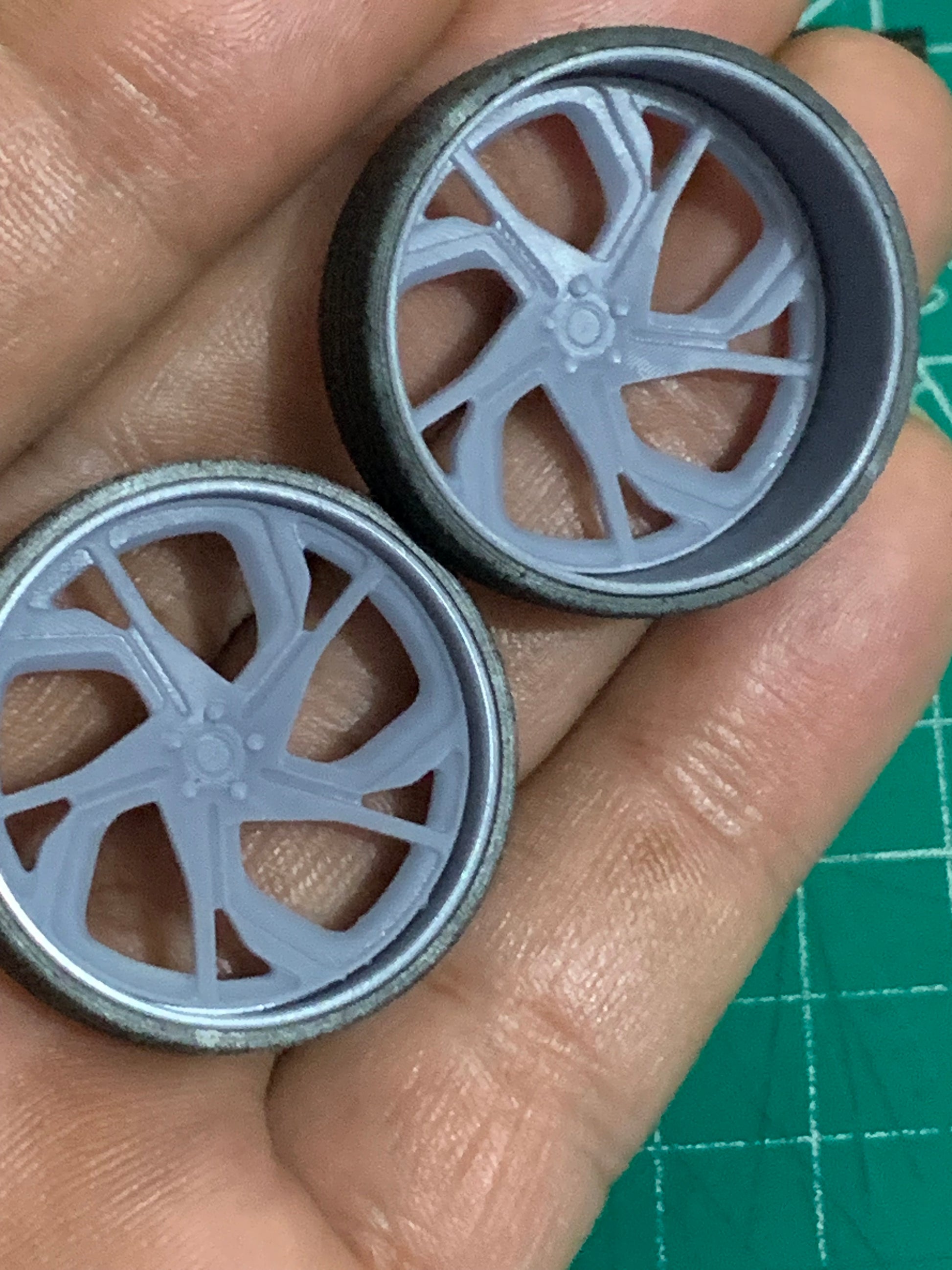 - 3D printed resin wheels & tires for a 1/25 scale.