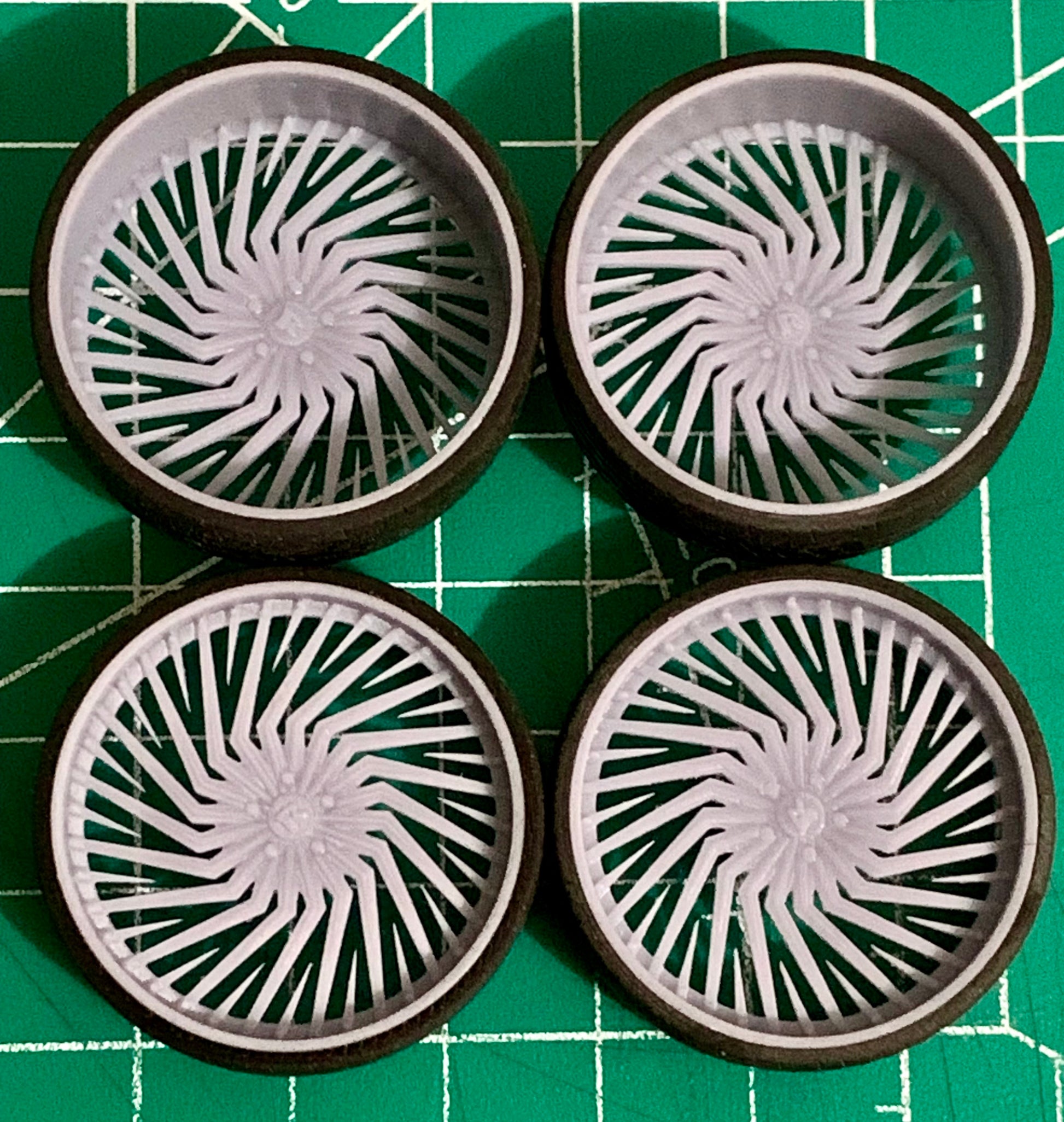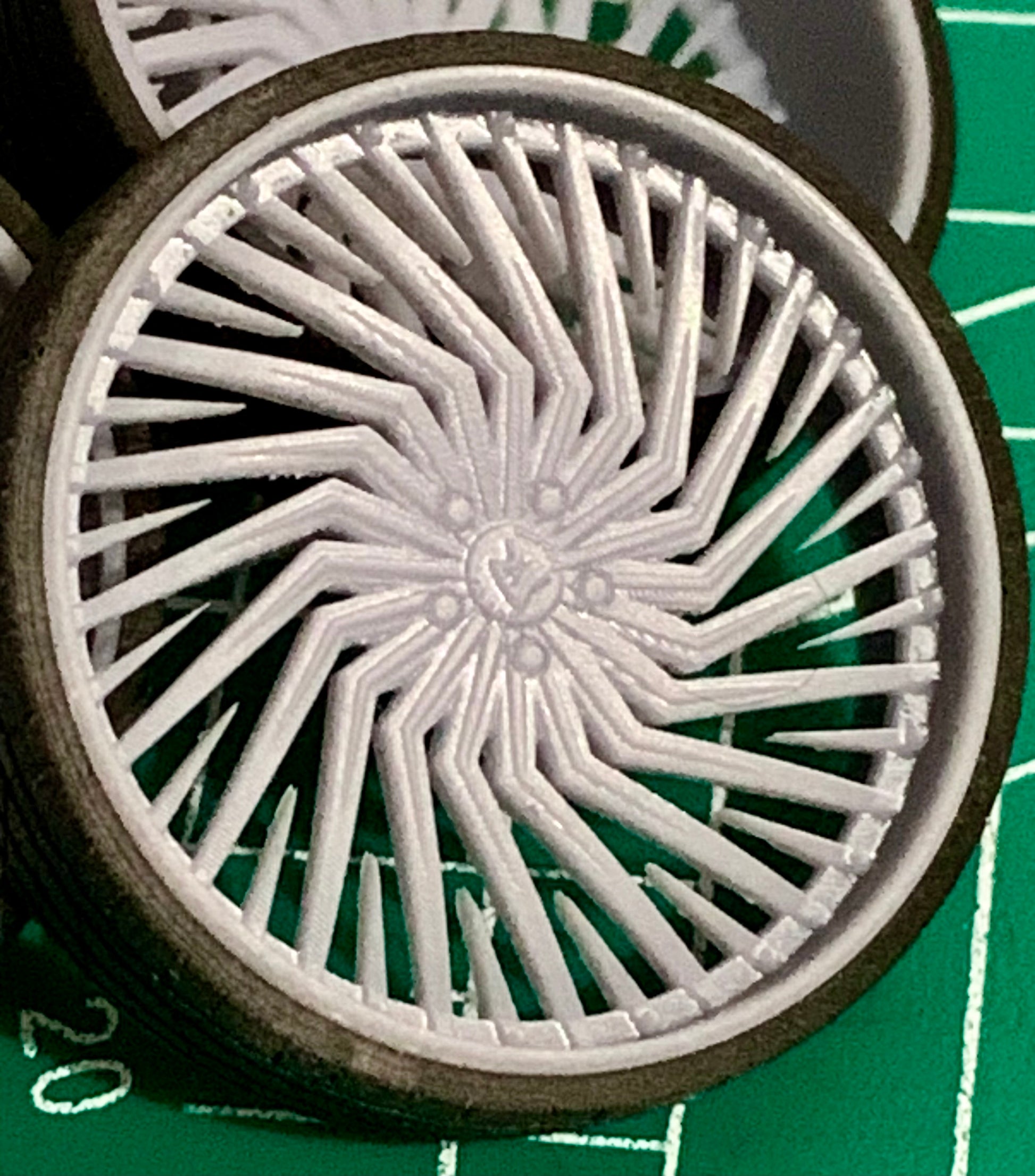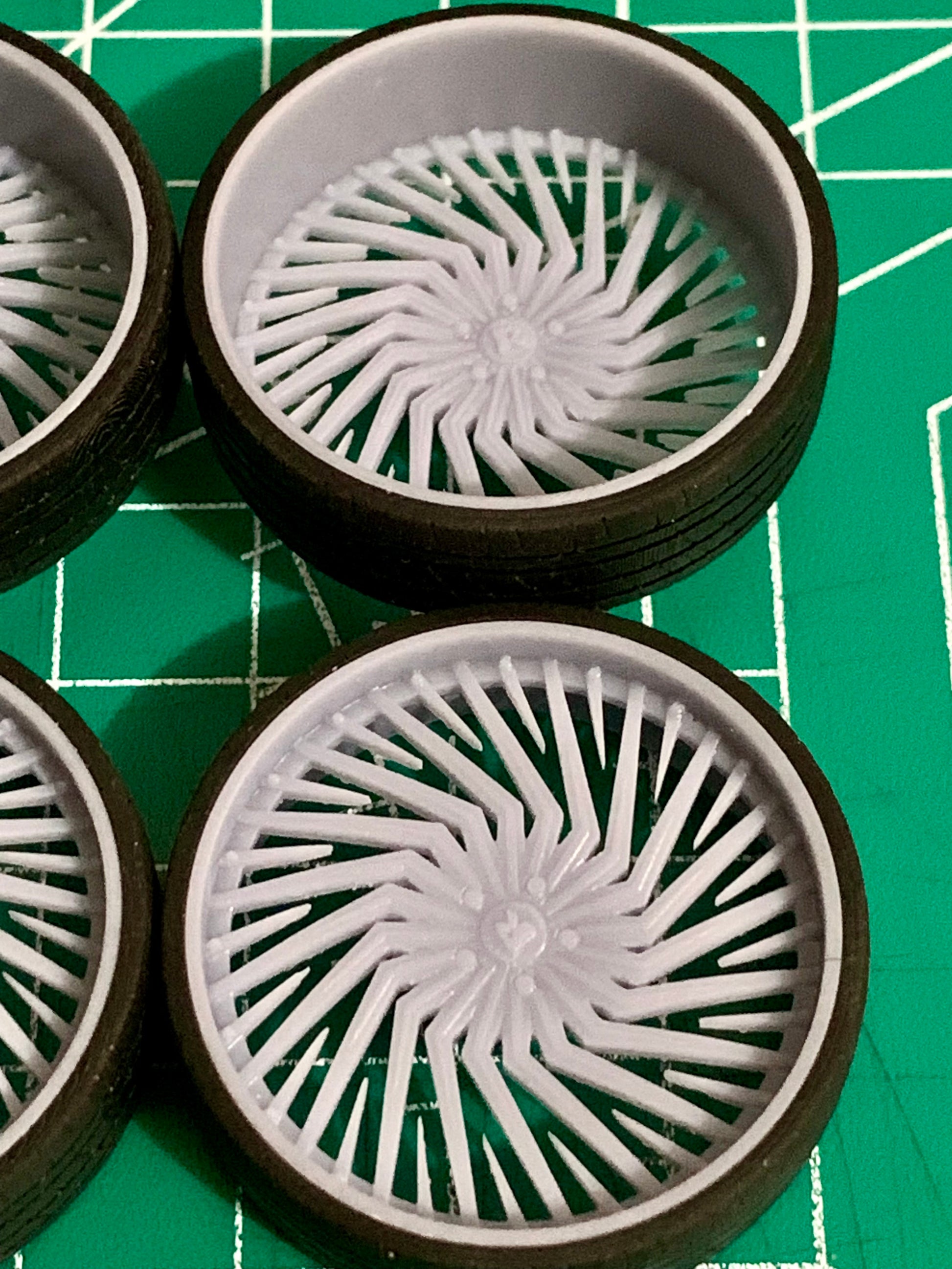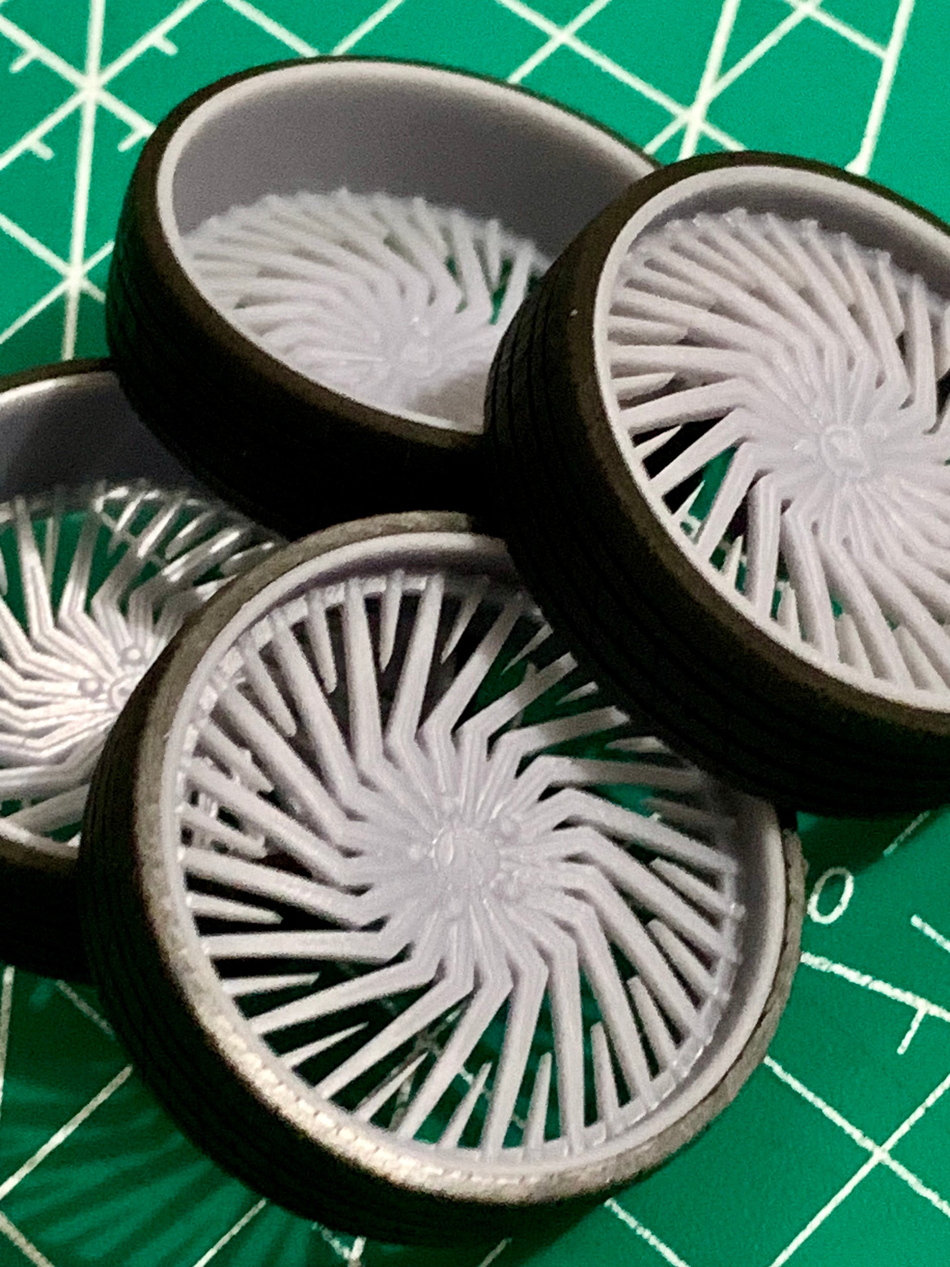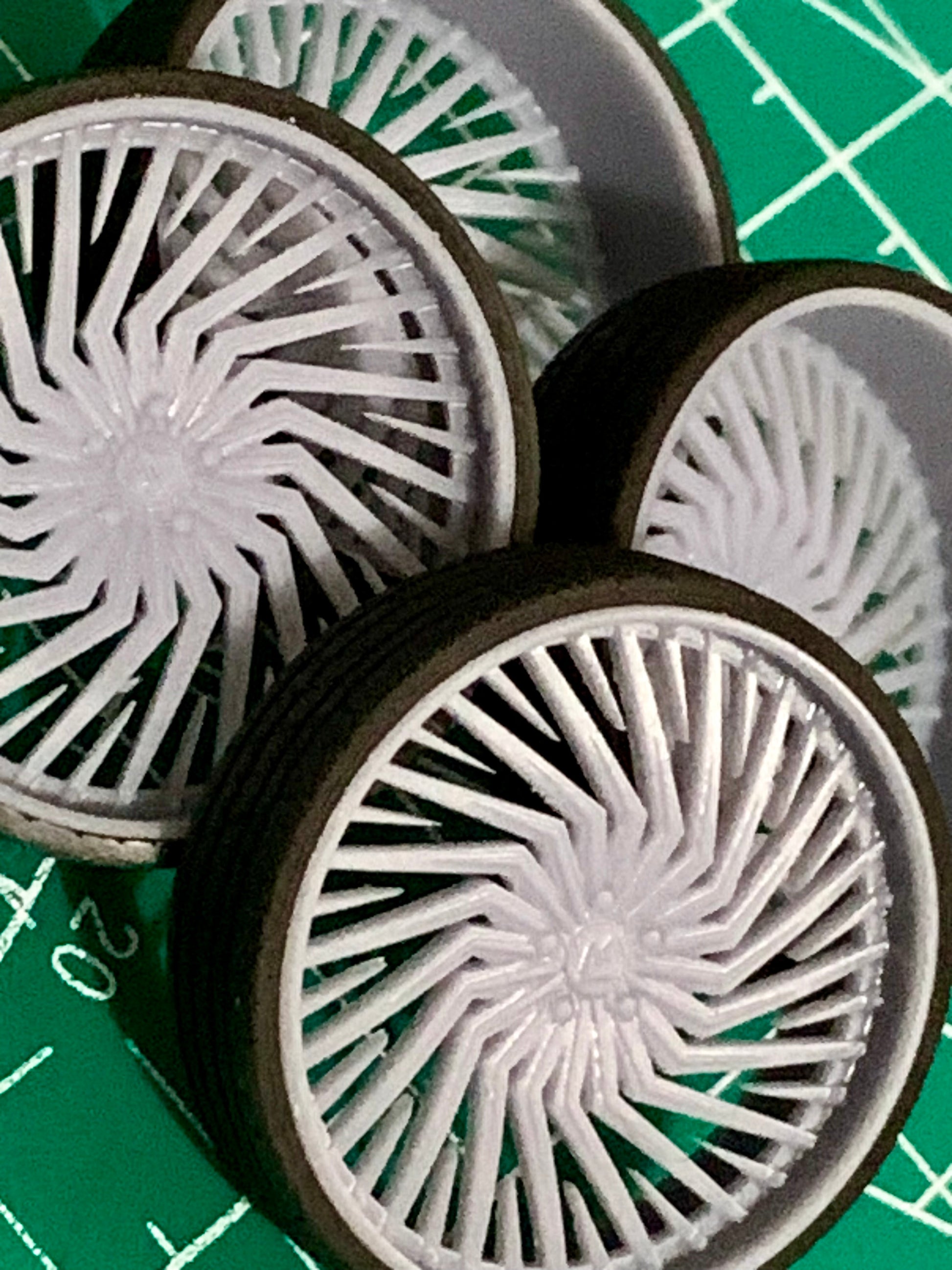 - 3D printed resin wheels & tires for a 1/25 scale.