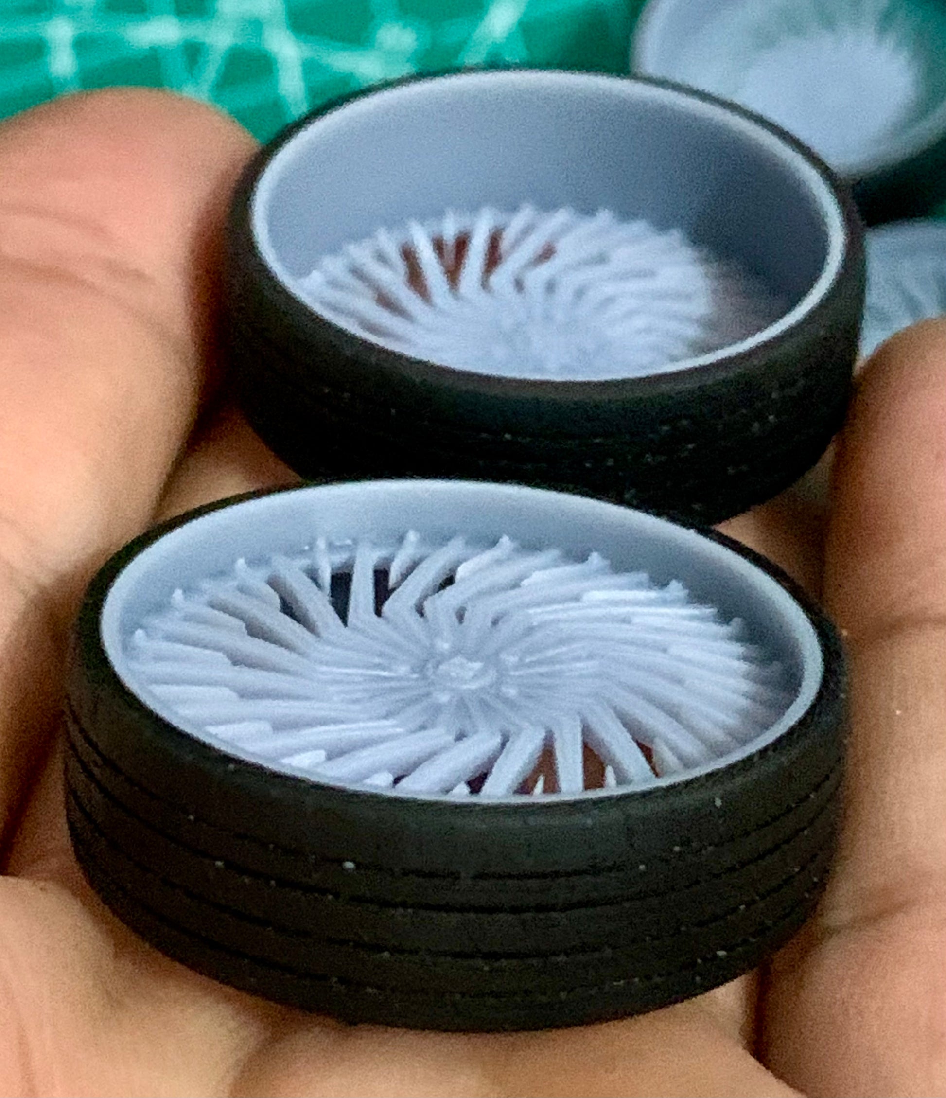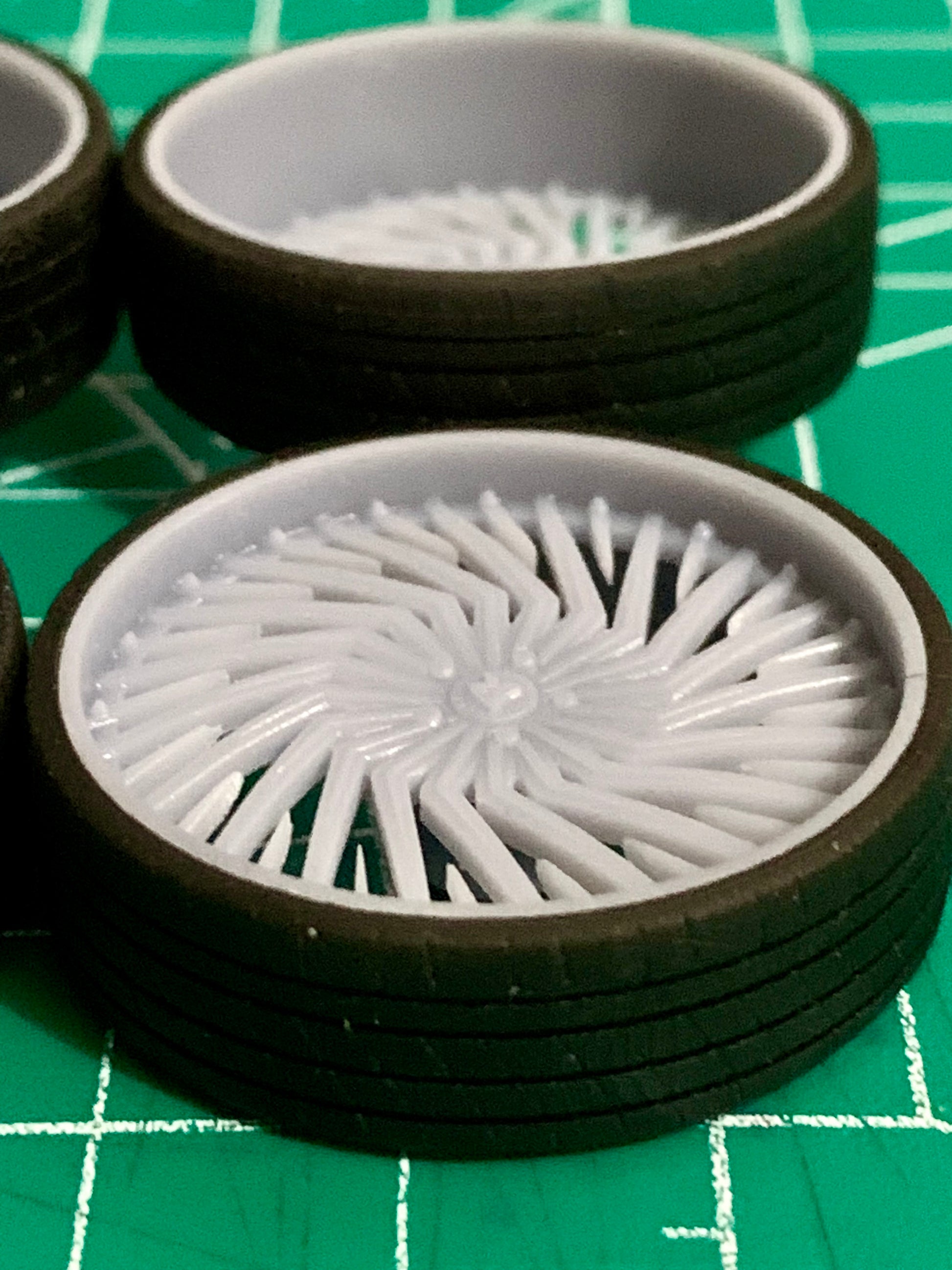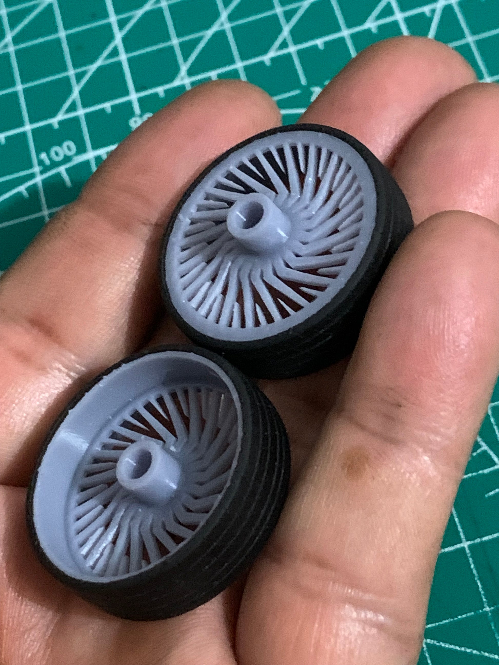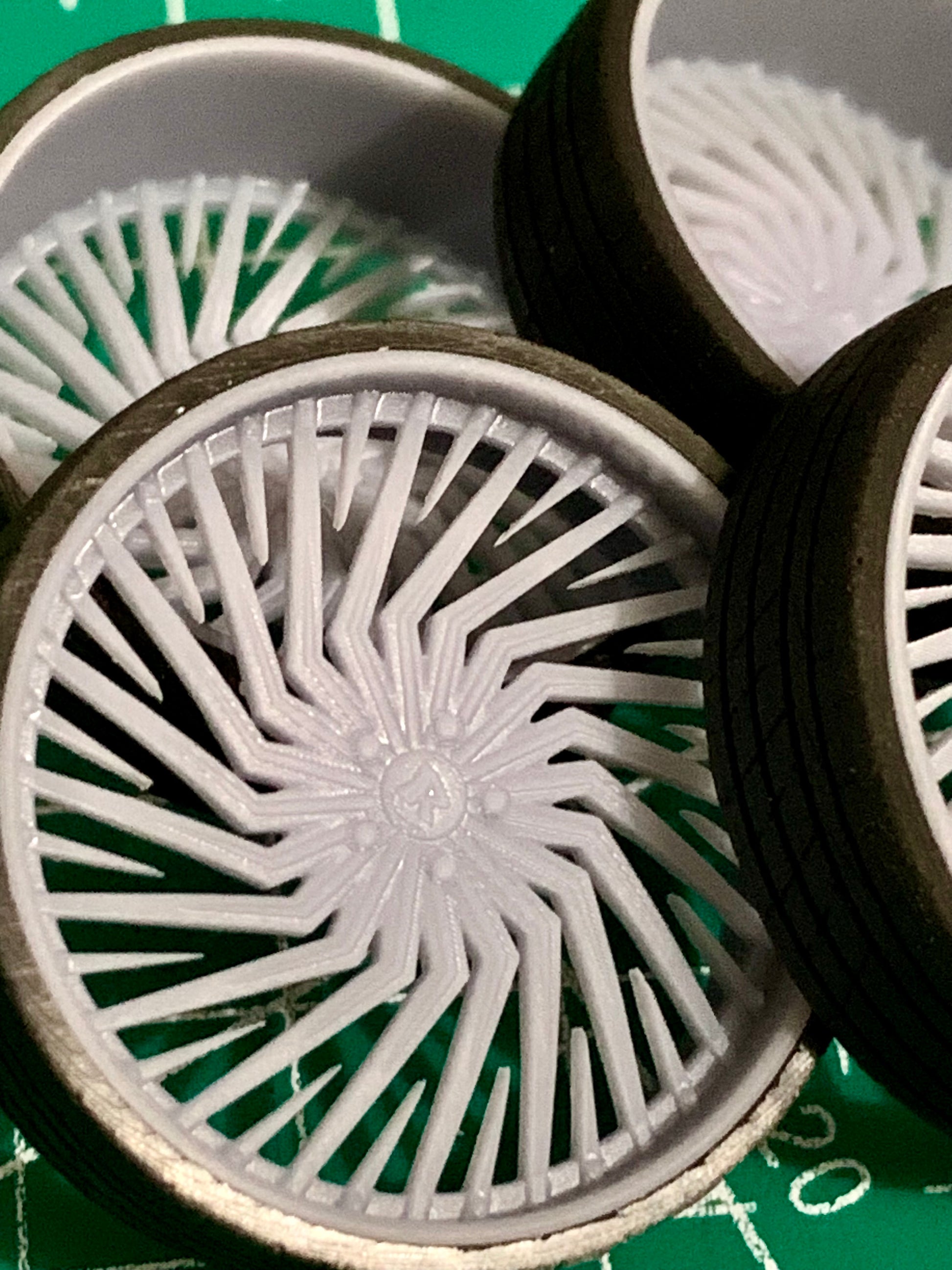 - 3D printed resin wheels & tires for a 1/25 scale.