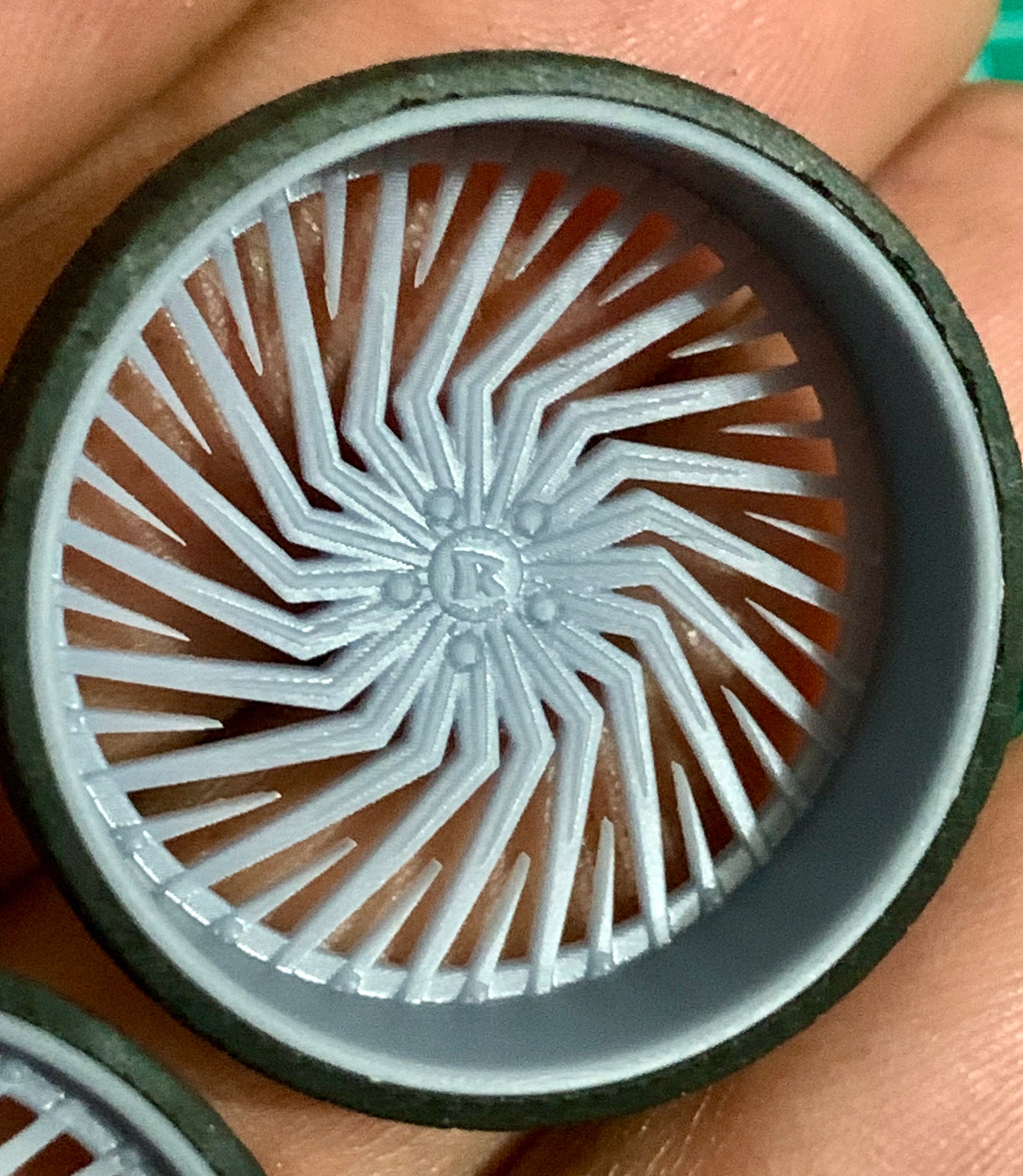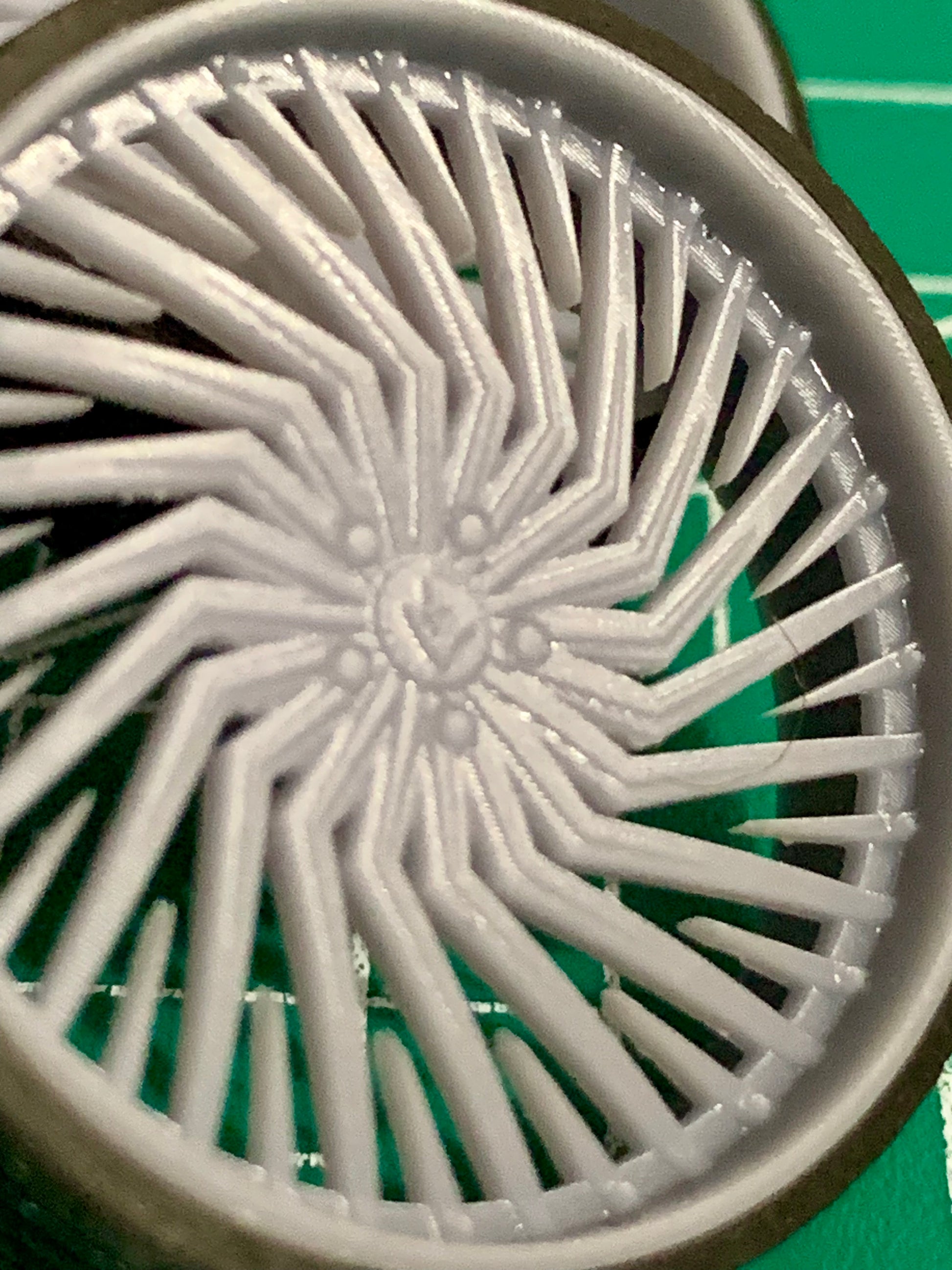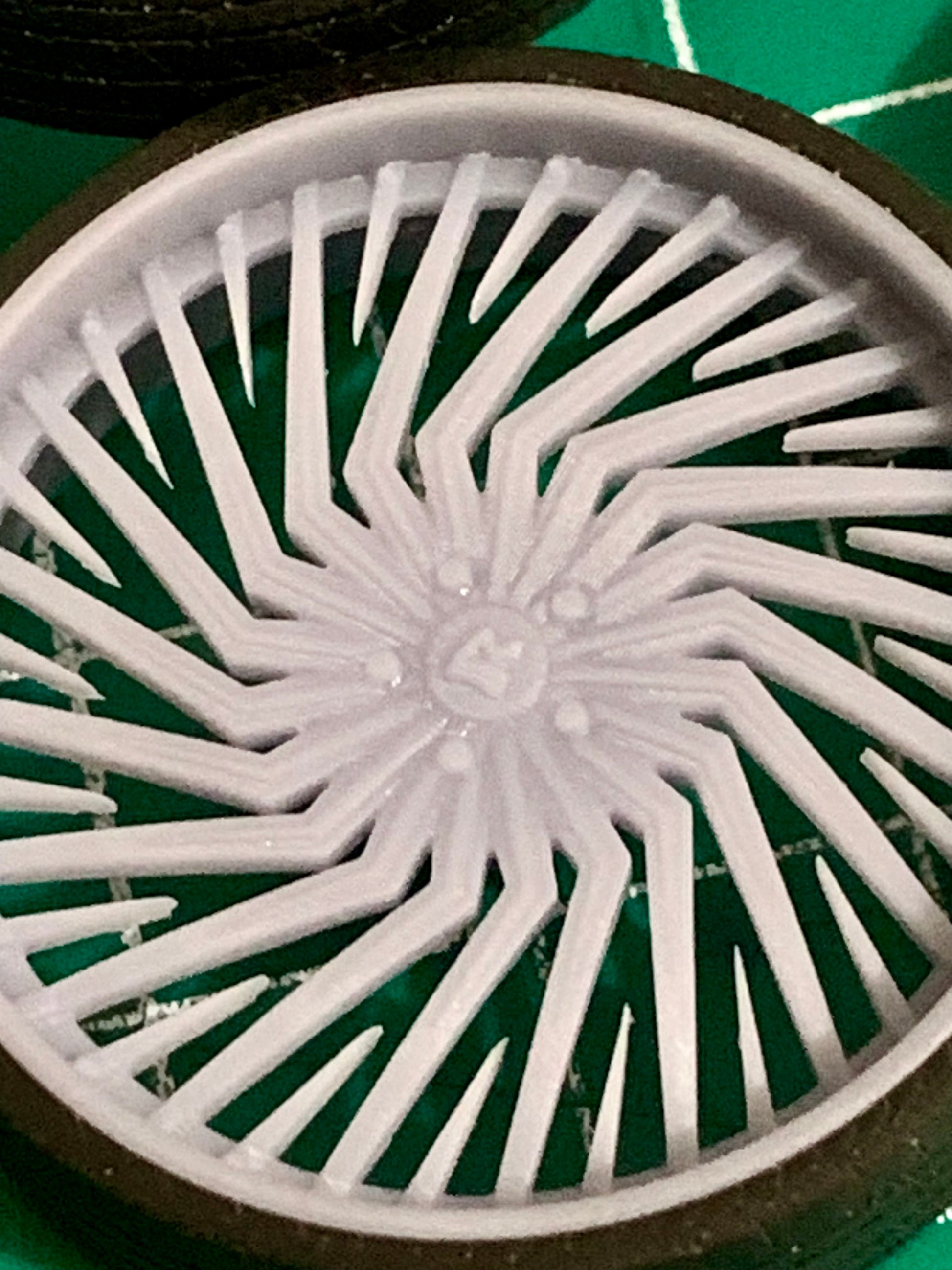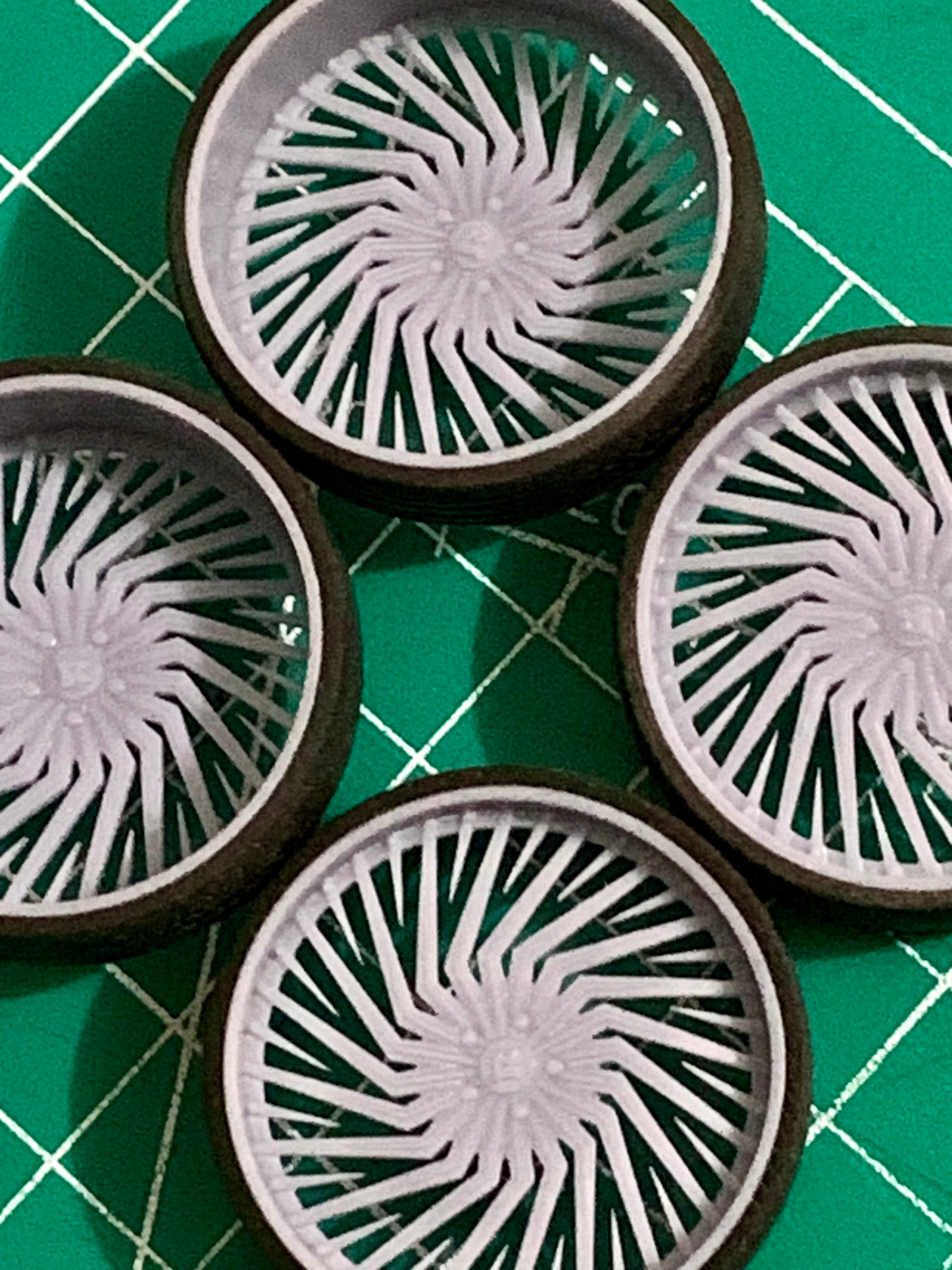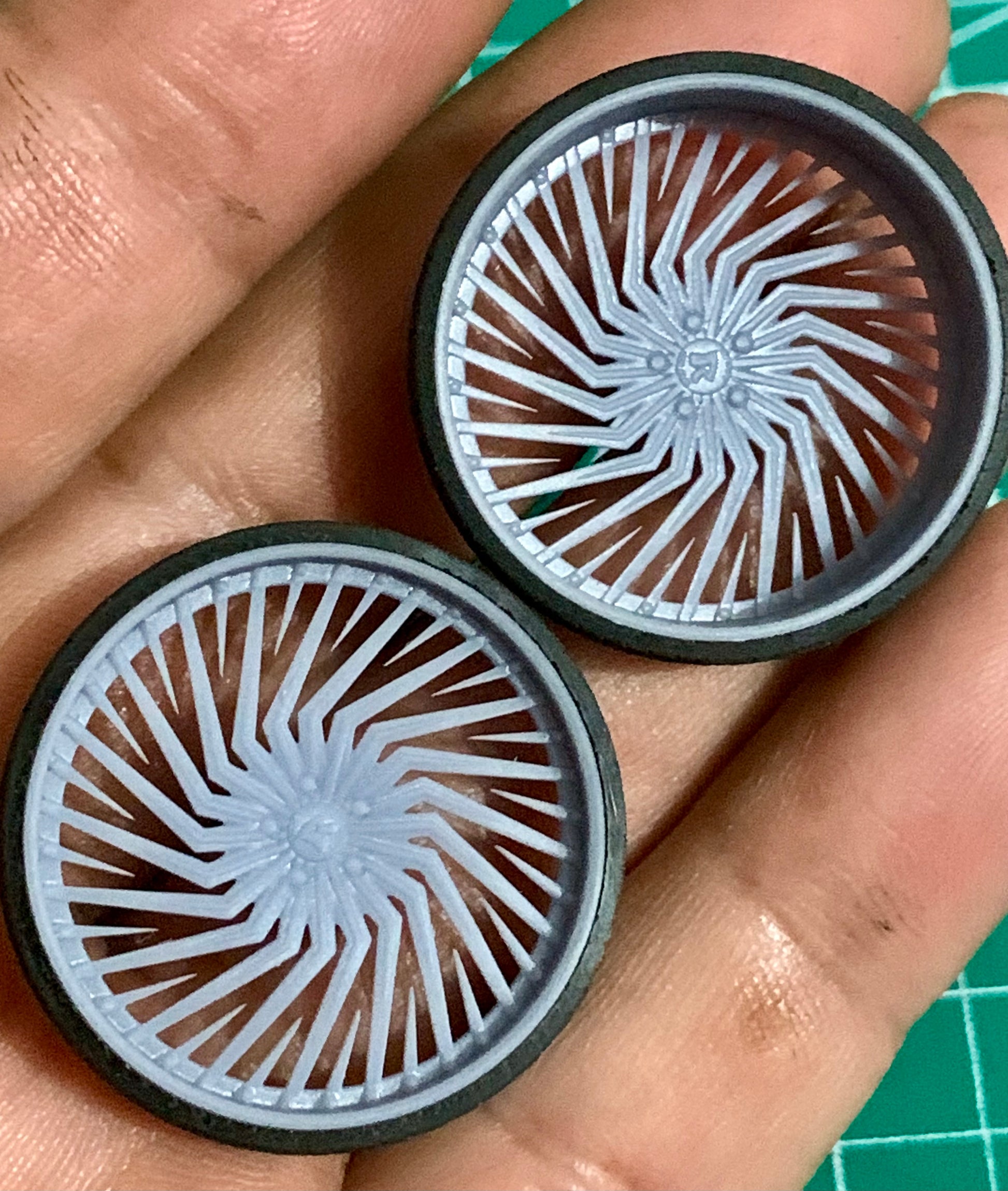 - 3D printed resin wheels & tires for a 1/25 scale.