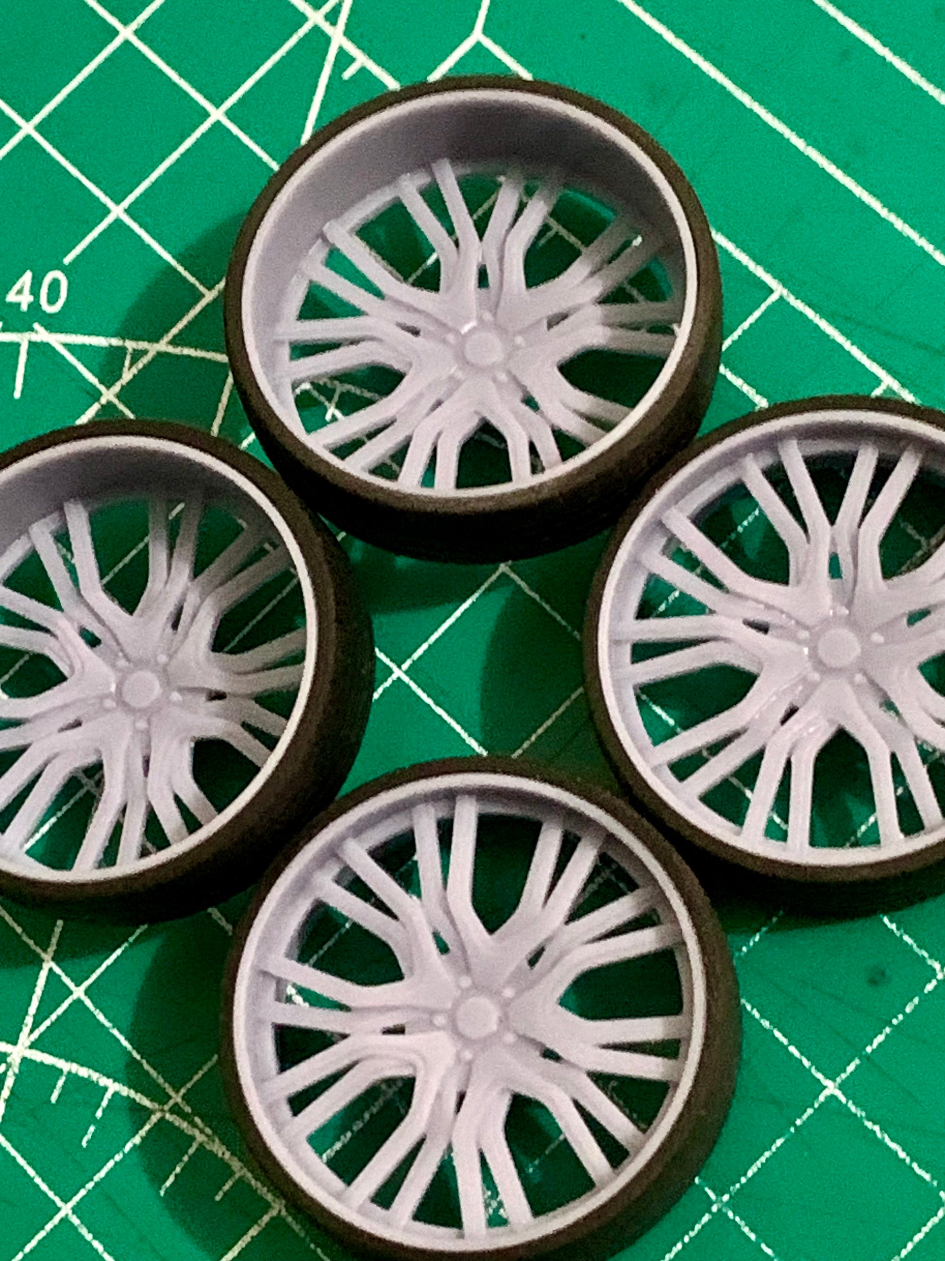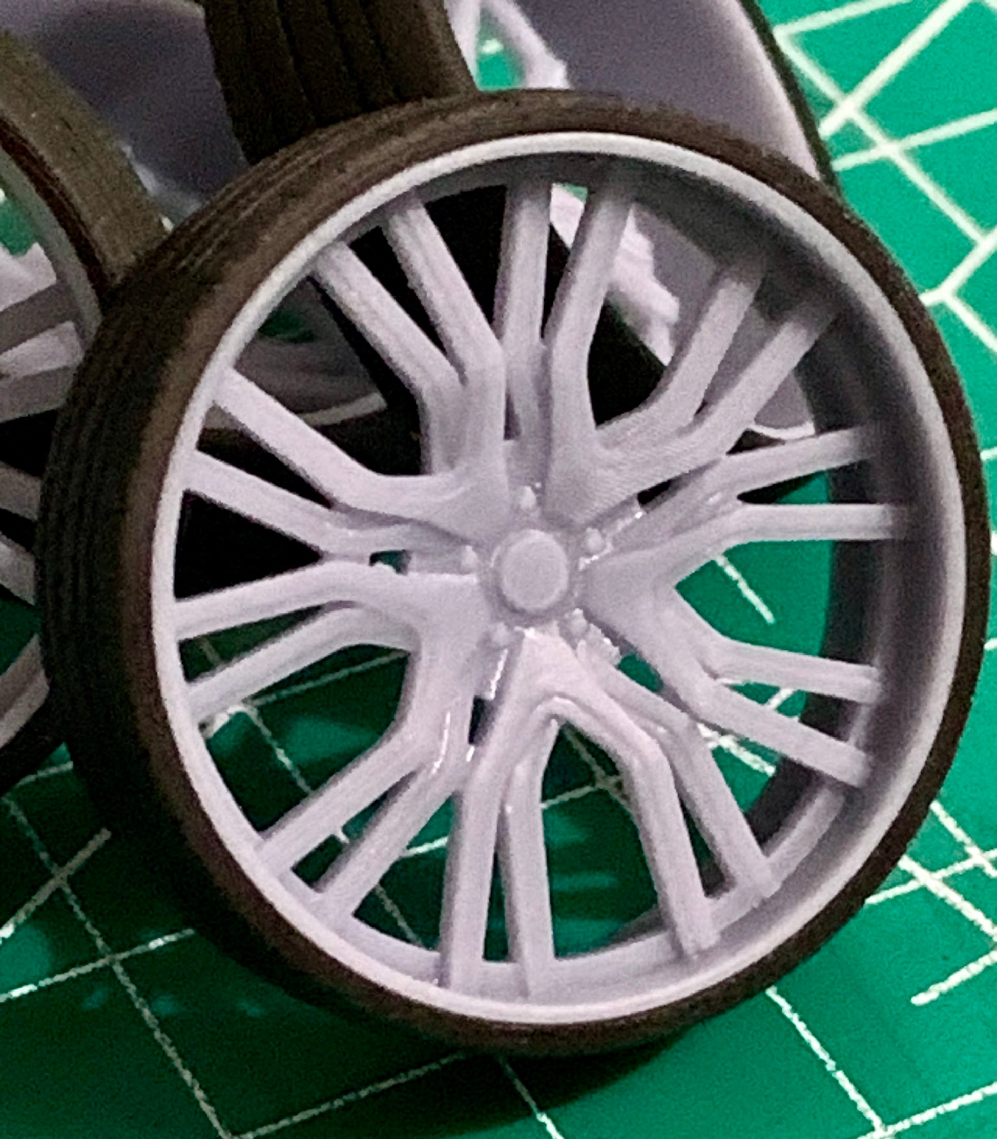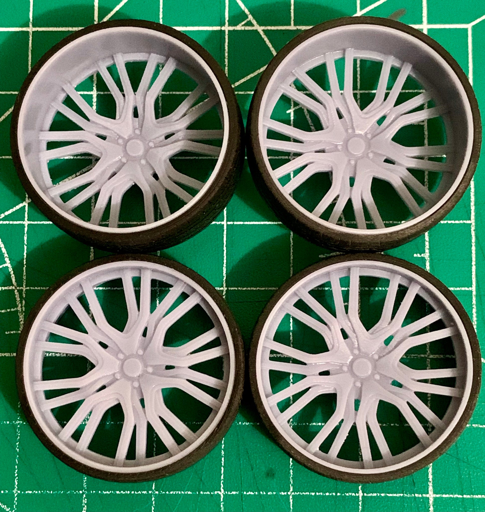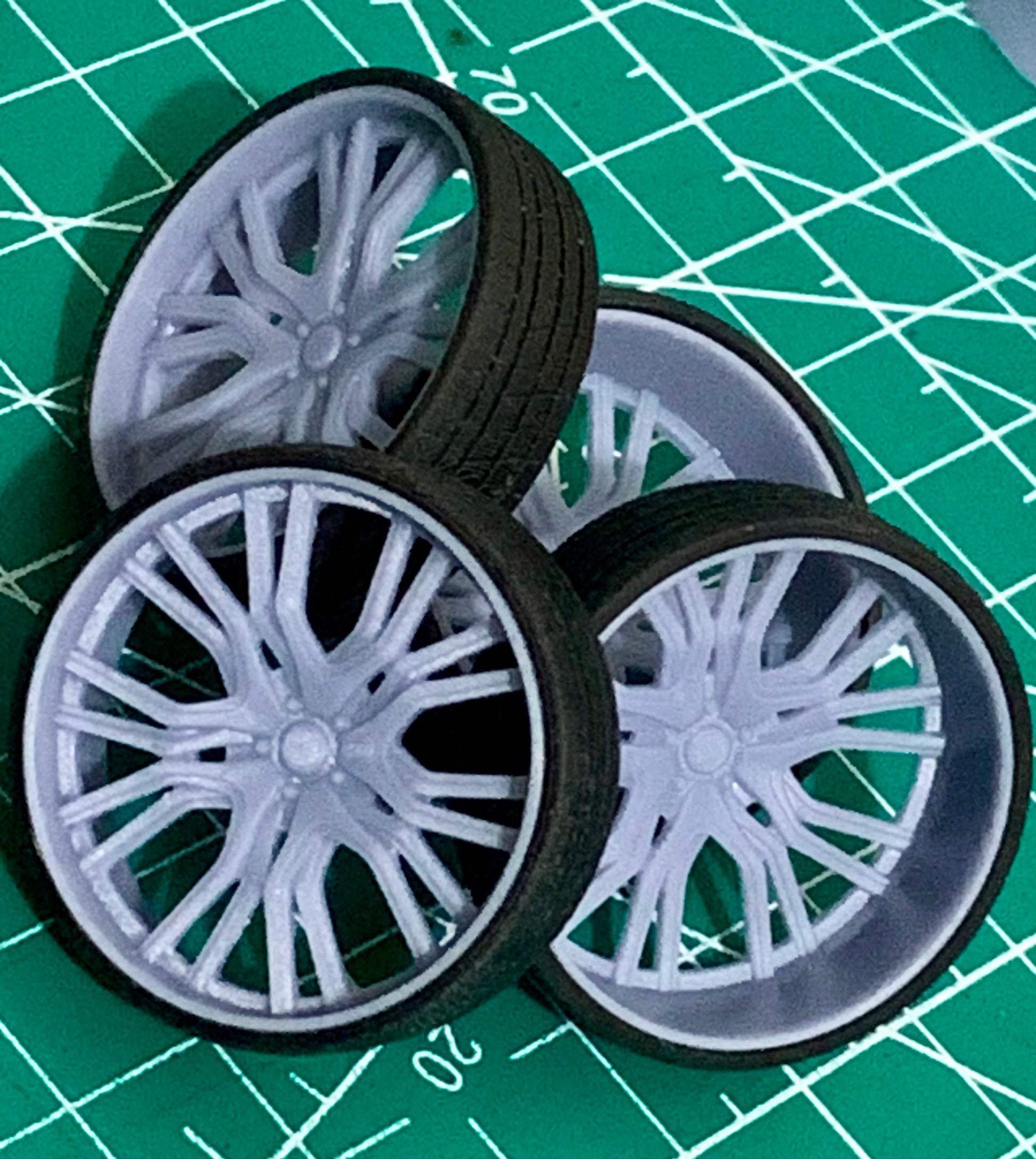 - 3D printed resin wheels & tires for a 1/25 scale.