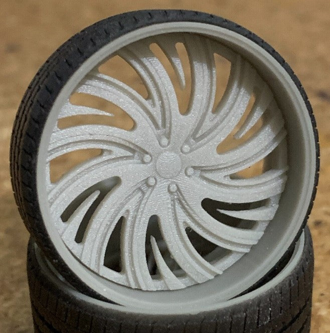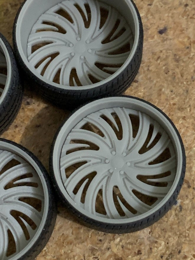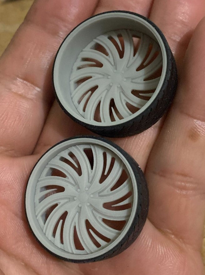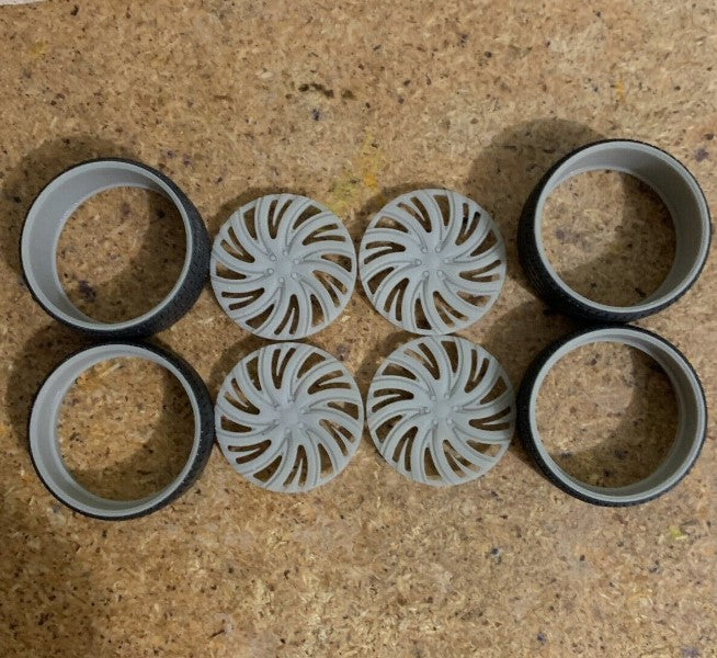 - 3D printed resin wheels & tires for a 1/25 scale.