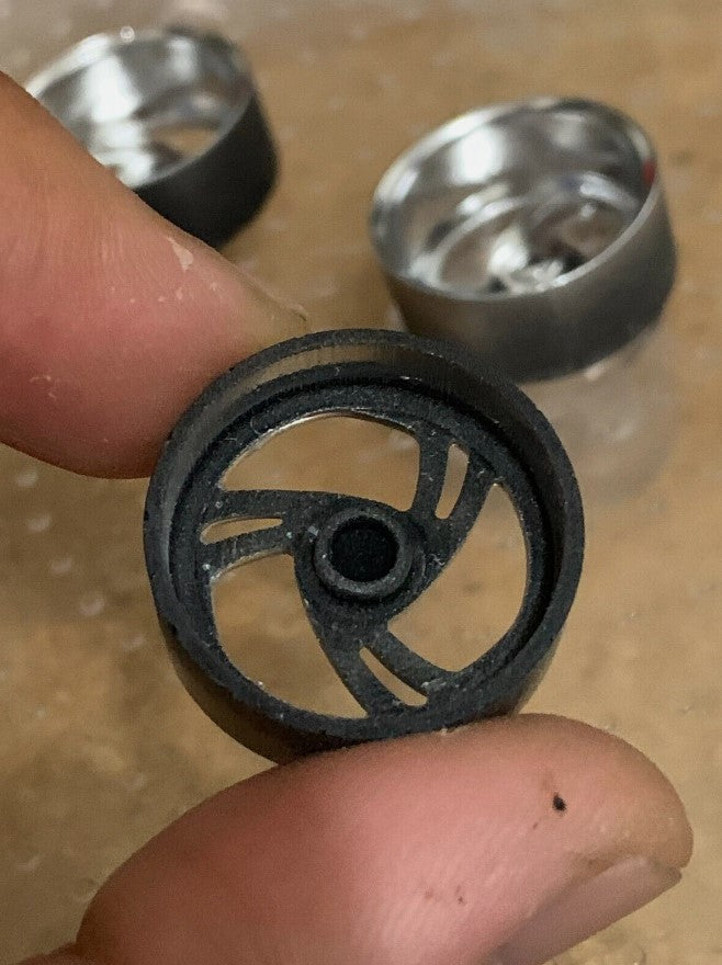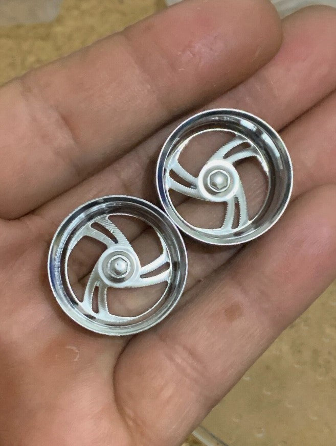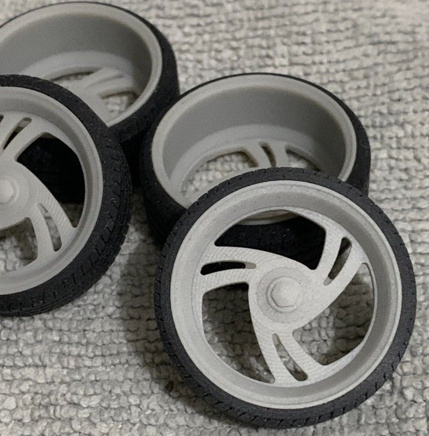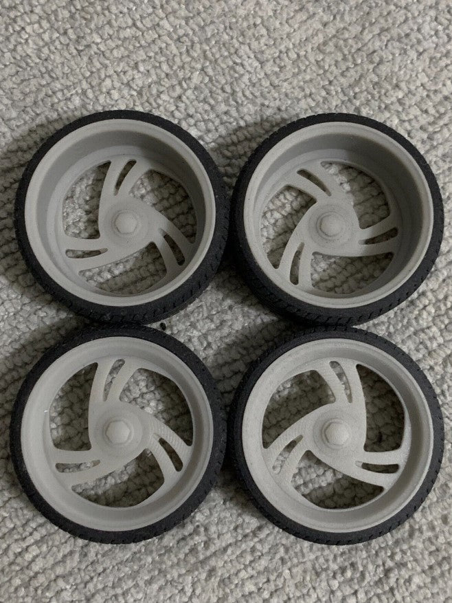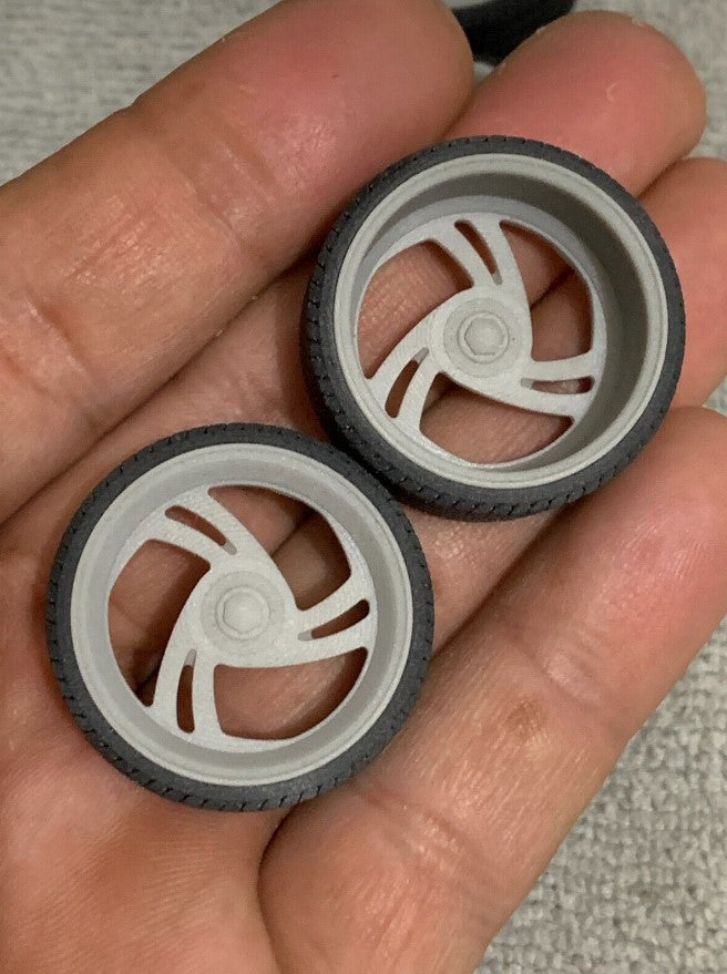 - 3D printed resin wheels & tires for a 1/25 scale.