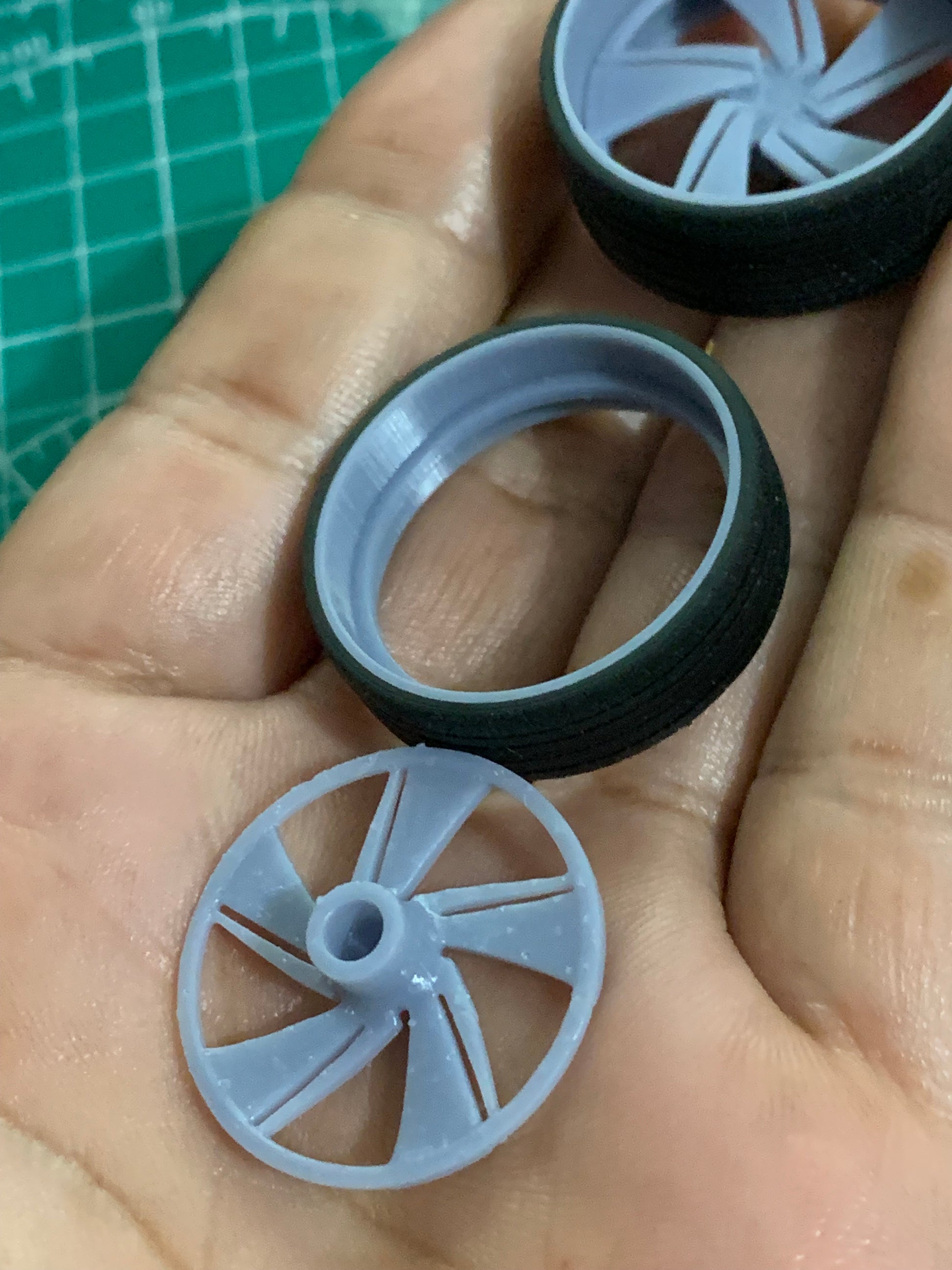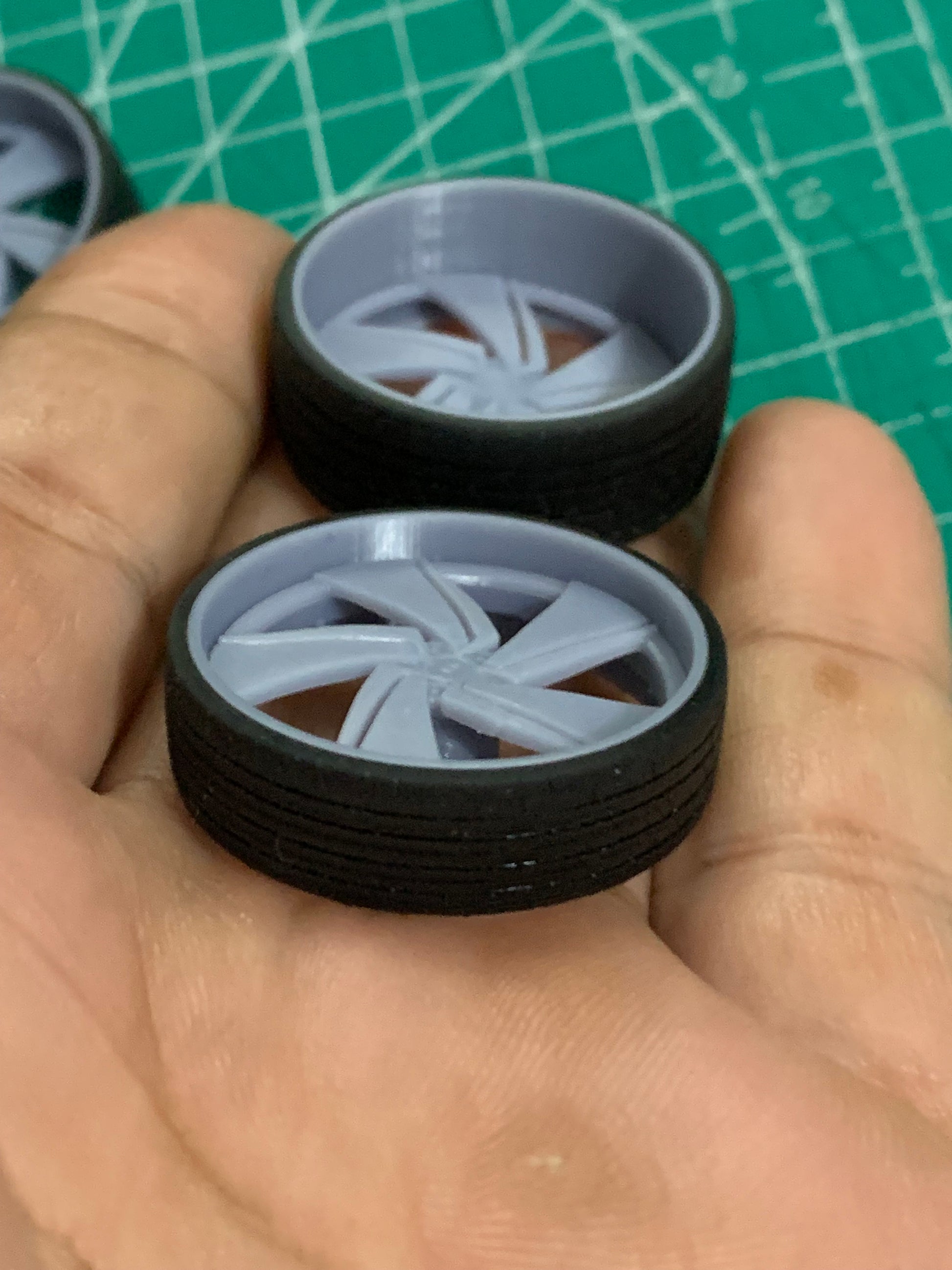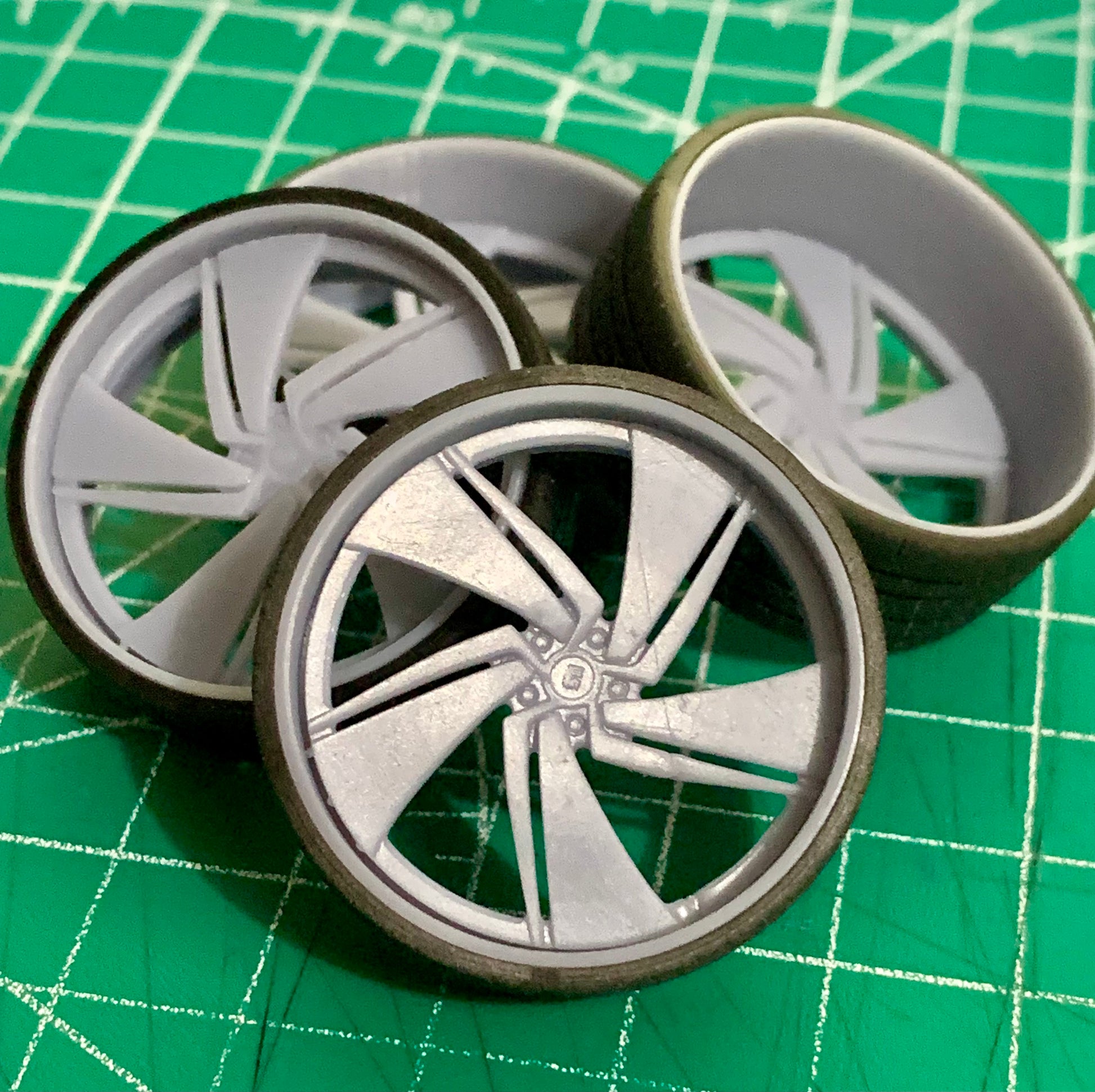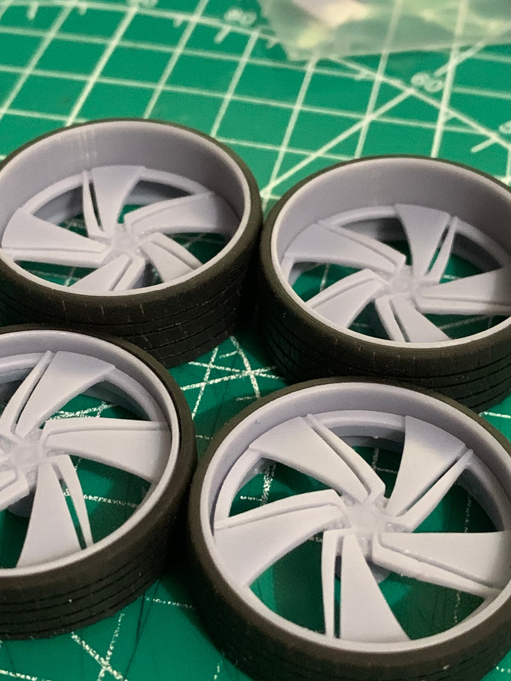 - 3D printed resin wheels & tires for a 1/25 scale.